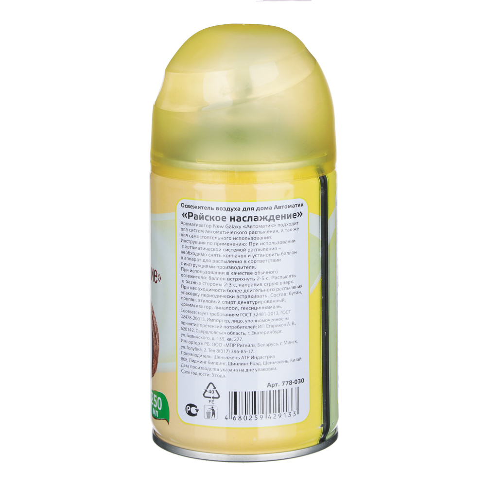 Освежитель воздуха "Автоматик" с ароматом райского наслаждения может использоваться как баллон для ручного опрыскивания помещения, также как и сменный для устройств автоматического распыления ароматизаторов. Применяется для всех видов помещений от ванной до спальной комнаты. Выгодная цена и высокое качество товара помогут вам принять решение в пользу сотрудничества с нами.