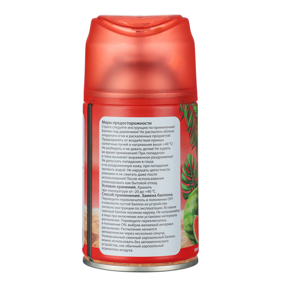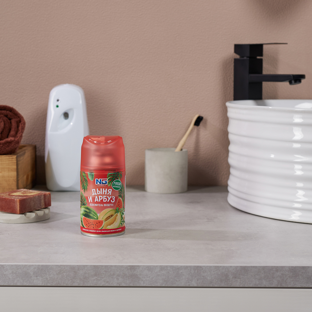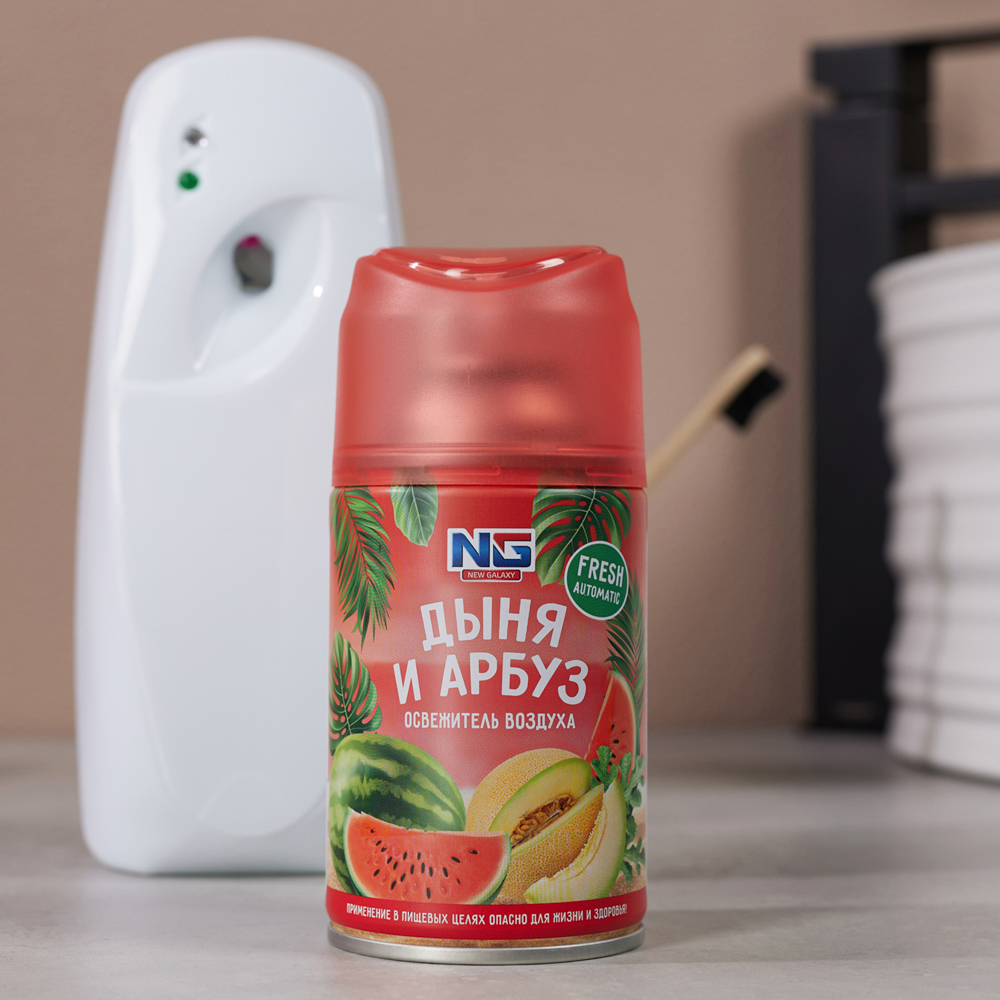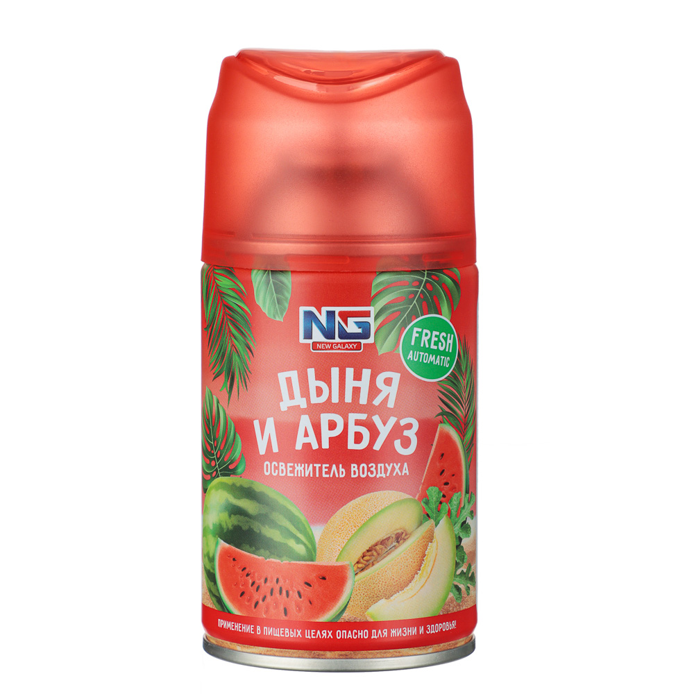 Освежитель воздуха NEW GALAXY Автоматик FRESH с ароматом «Дыня и арбуз» – это универсальный сменный аэрозольный баллон для автоматического освежителя воздуха. Освежитель имеет легкий освежающий аромат, который прекрасно маскирует неприятные запахи. Экологичный, не содержит озоноразрушающих хладонов.