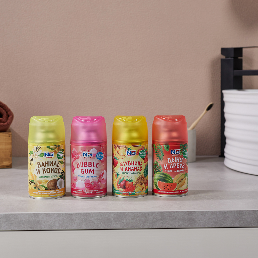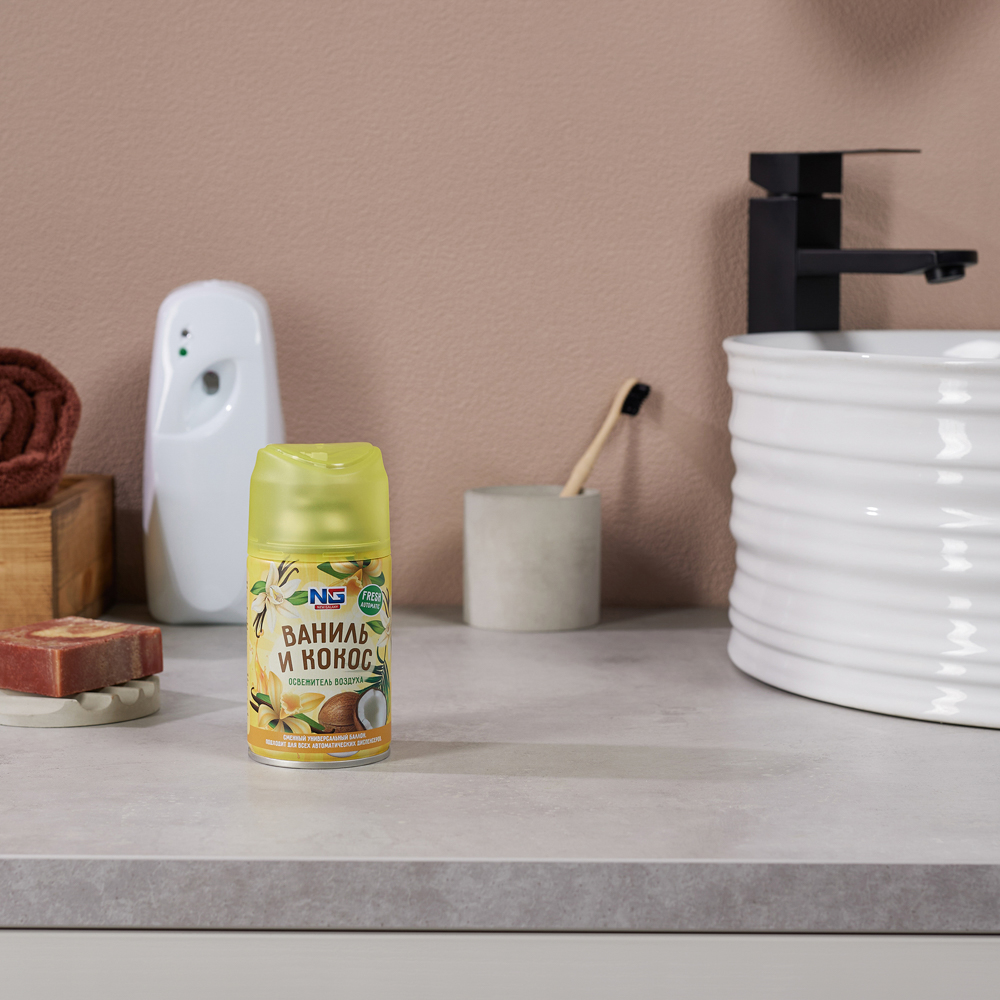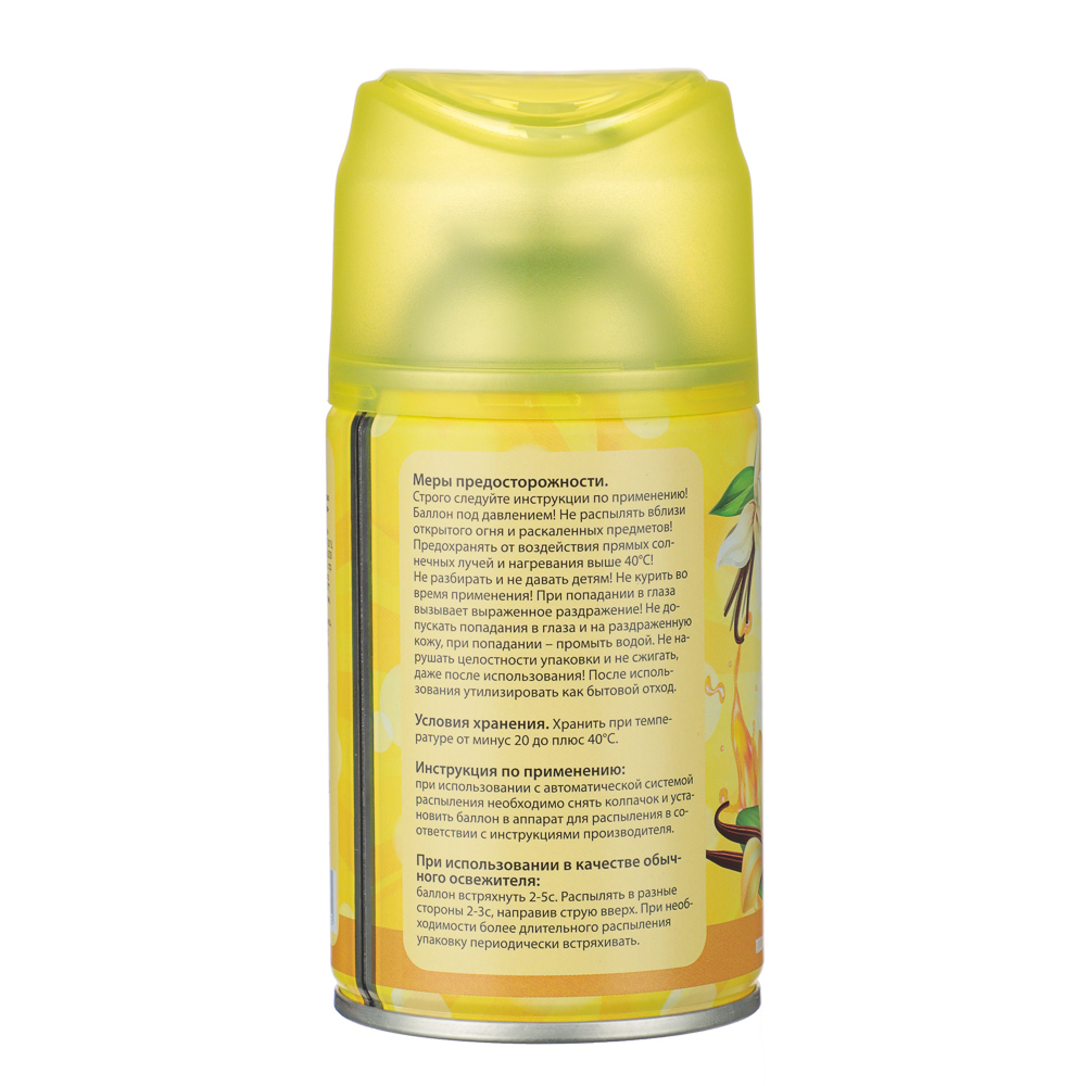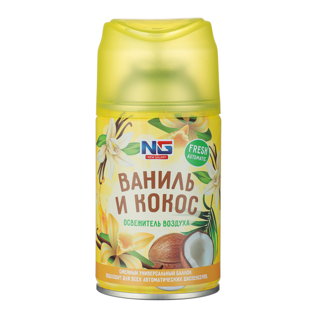 Освежитель воздуха Автоматик Fresh Ваниль и кокос. Объем 250 мл. Освежитель воздуха имеет современную формулу «3in1 Air Care», которая гарантирует тройное действие: 1. Эффективно нейтрализует и поглощает неприятный запах. 2. Наполнение помещение неповторимым ароматом. 3. Придает ощущение свежести и чистоты.Чистота и красивый аромат в доме – неотъемлемые атрибуты ощущения гармонии. Освежитель для воздуха мгновенно наполнит комнату восхитительным запахом зеленых фруктов и ярких цитрусов, элегантными древесными аккордами и мягким мускусом.