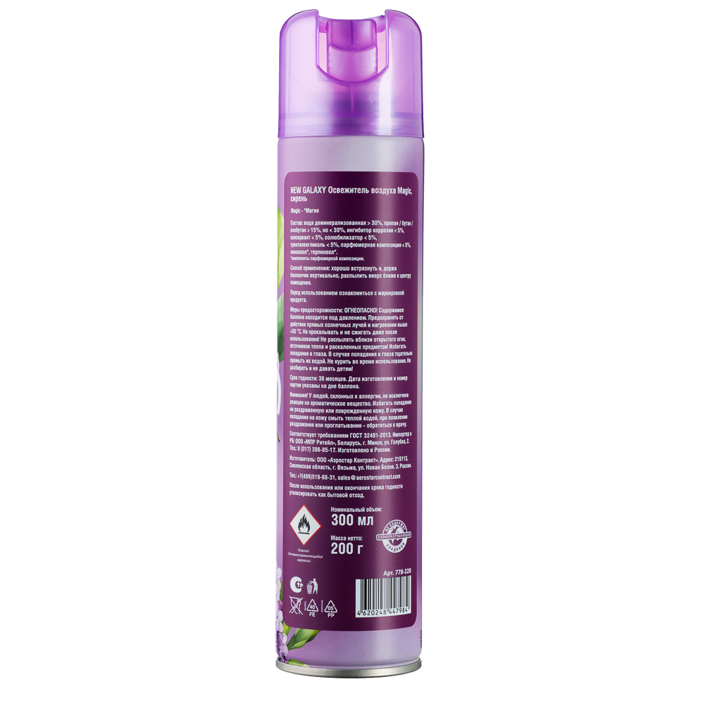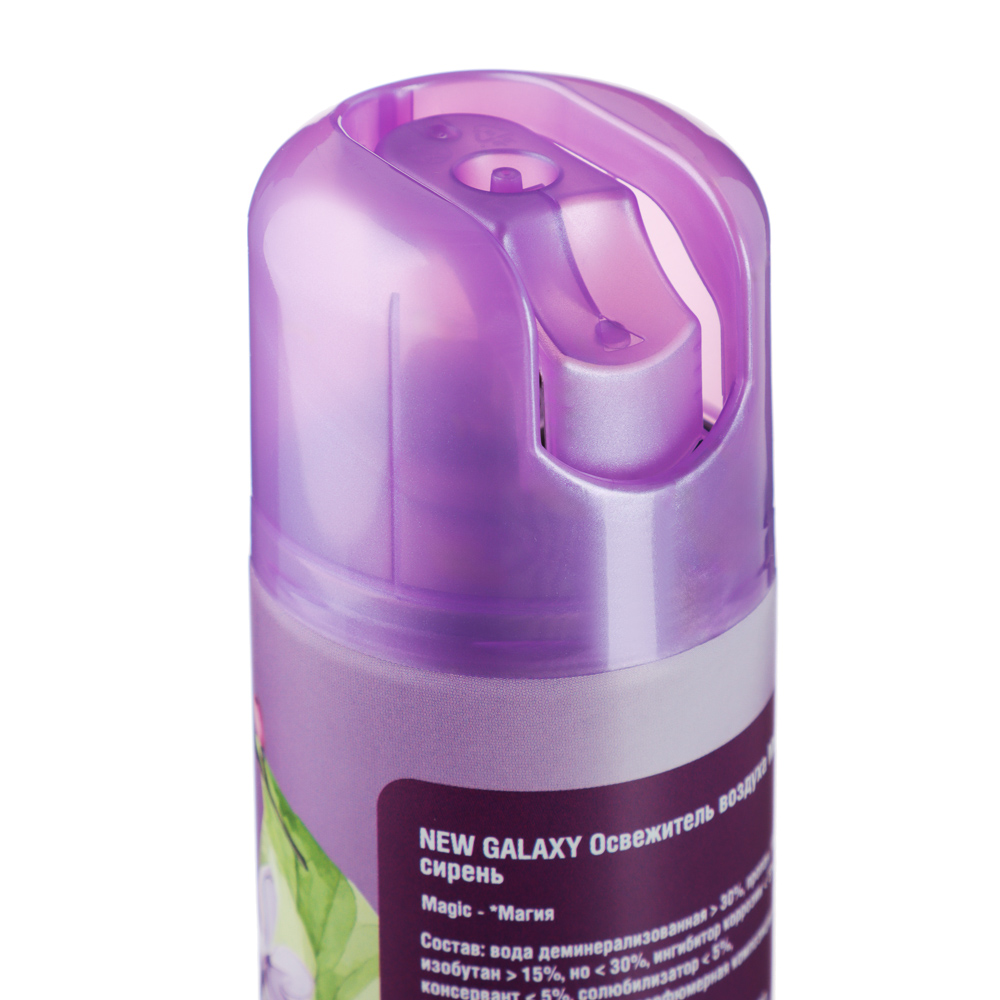 Освежитель воздуха NEW GALAXY «Magic» 5 в 1, 300 мл, с ароматом сирени используется в санузлах, а также в офисах, жилых помещениях, гардеробных. Эффективно устраняет нежелательные запахи, освежает воздух. Действует моментально после распыления. Цветочный аромат обладает продолжительным действием. Нажимной дозатор позволяет комфортно регулировать расход средства.