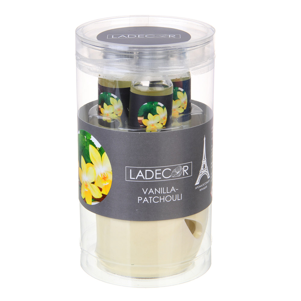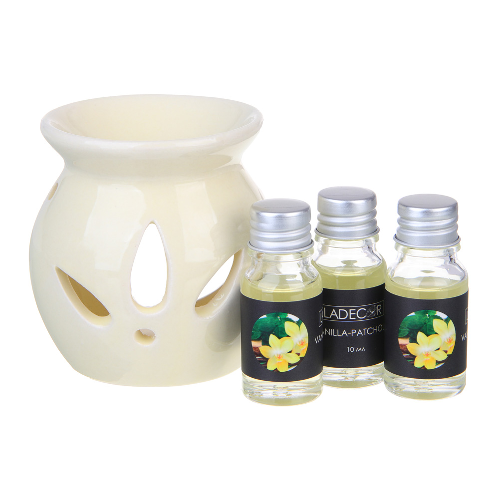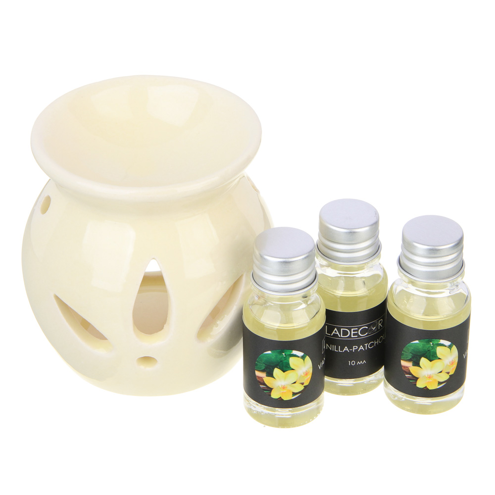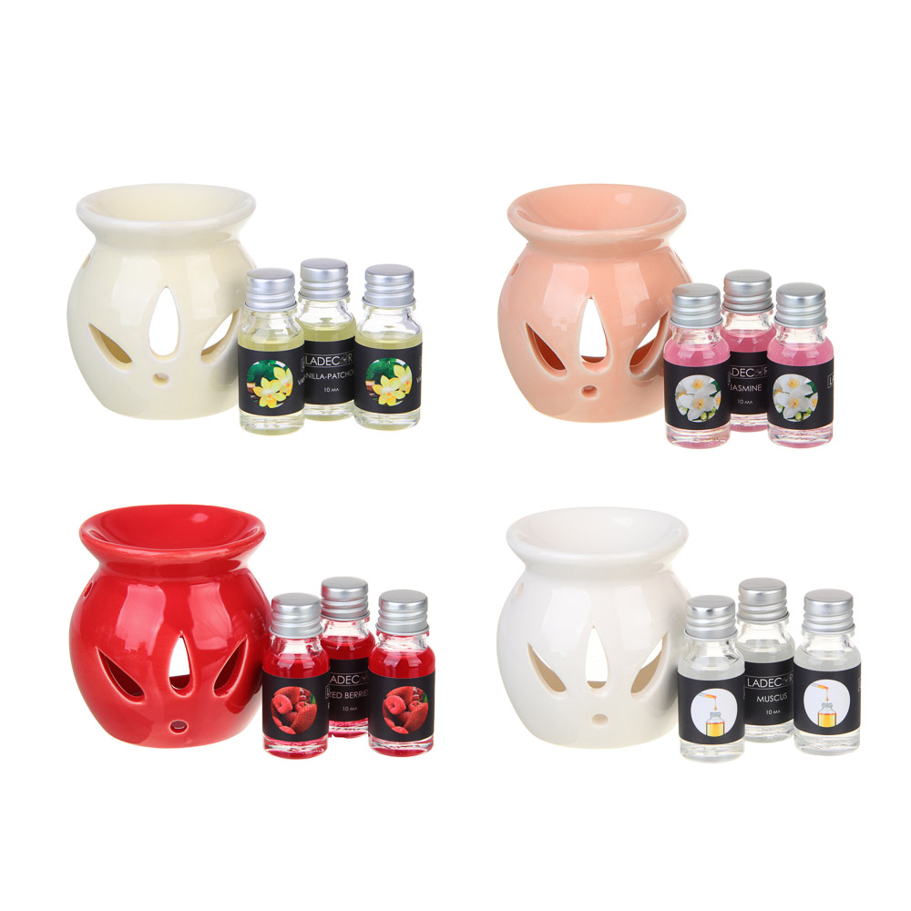 Ароманабор LADECOR непременно порадует любителей ароматерапии. Включает керамическую аромалампу и 3 флакона масла по 10 мл в каждом. Лампа имеет приятный эстетичный дизайн и станет акцентным элементом интерьера помещения. Концентрированные ароматические масла имеют приятный душистый аромат, не раздражают обонятельные рецепторы, способствуют релаксации и снятию нервного напряжения. Прекрасный подарок для женщин. 4 вида на выбор: аромат красных ягод, пачули-ваниль, жасмин, мускус.