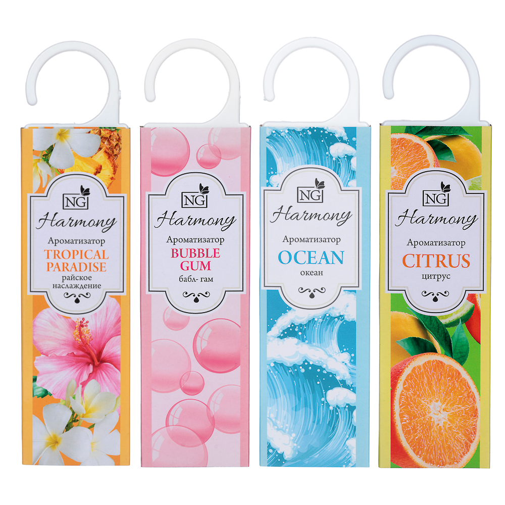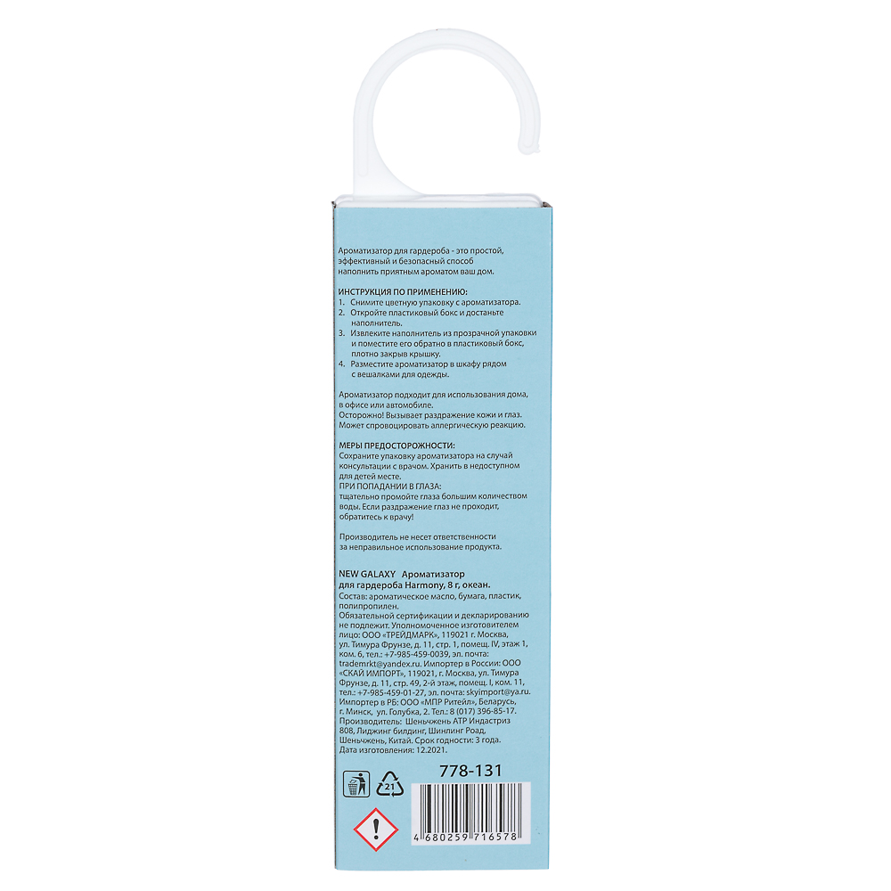 Ароматизатор для гардероба NEW GALAXY «Harmony» – это простой, эффективный и безопасный способ наполнить помещение приятным ароматом. Подходит для использования в доме, офисе, автомобиле. Источает приятный ненавязчивый аромат, не раздражая обонятельные рецепторы. Помогает избавиться от нежелательных запахов. 4 аромата в ассортименте: райское наслаждение, свежесть океана, цитрус, бабл гам.