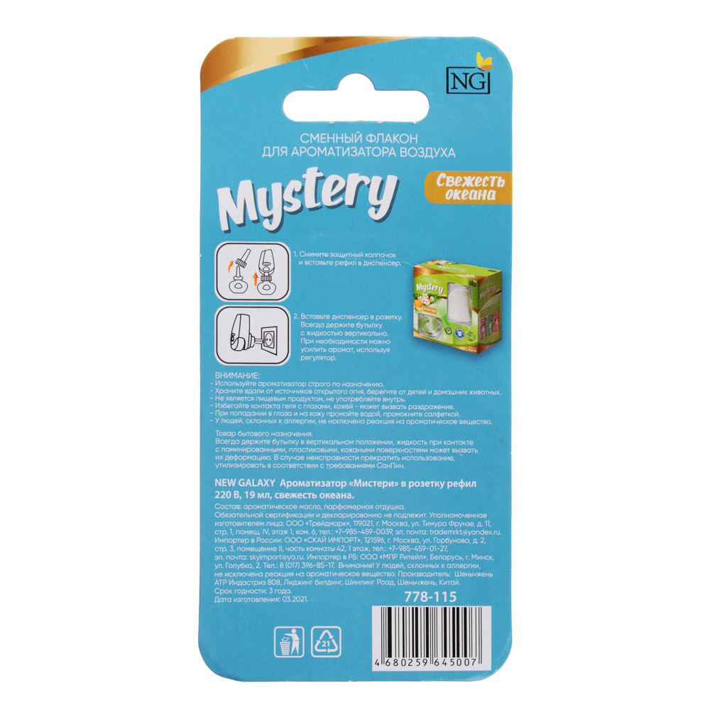 “Мистери” - это рефил, сменный флакон для ароматизатора от New Galaxy. Его вставляют в диспенсер и включают в розетку. Подходит для дома: устраняет неприятные запахи и наполняет воздух ароматом. В ассортименте 4 аромата: Летний бриз, Мистический сад, Лаванда, Свежесть океана. Объем 19 мл - хватает на 90 дней. Инструкция на упаковке.