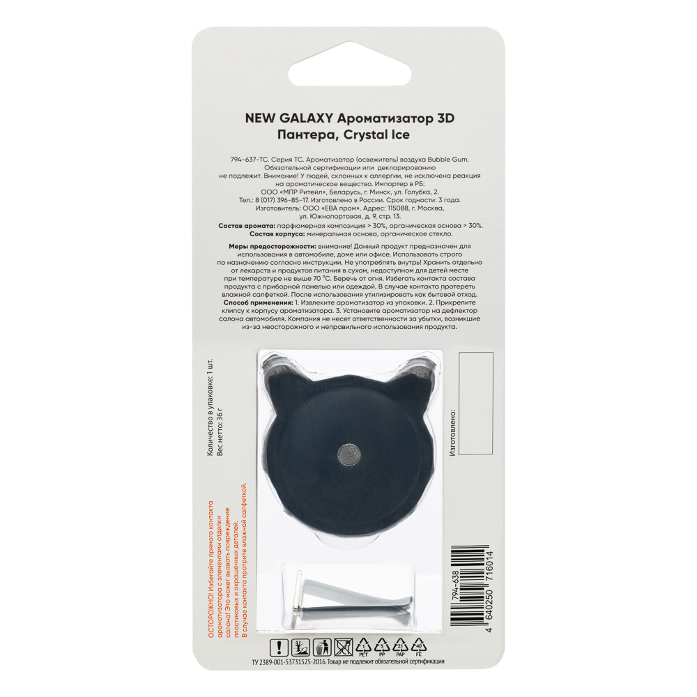NEW GALAXY представляет ароматизатор 3D “Пантера”, который выполнен в виде стильного и элегантного 3D-дизайна пантеры и предназначен для использования в автомобиле. Этот продукт предназначен для установки на дефлектор и обеспечивает равномерное распространение аромата по салону автомобиля. Изделие изготовлено из качественных и долговечных материалов, что обеспечивает его прочность и устойчивость к различным условиям эксплуатации. Аромат “Crystal Ice” имеет свежий и прохладный аромат, который идеально подходит для создания приятной атмосферы в автомобиле. Этот ароматизатор станет отличным выбором для любителей свежих и прохладных ароматов, которые помогут снять усталость и напряжение после долгого дня за рулем. Он также может быть отличным подарком для автолюбителей, которые ценят стиль, качество и функциональность в одном продукте.