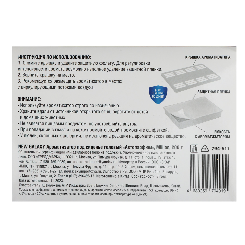 Не хочется загромождать салон автомобиля лишними предметами? Тогда ароматизатор под сиденье – ваш выбор. Компактная емкость с ароматизатором располагается в скрытом от глаз месте и никому не мешает. Степень интенсивности аромата можно регулировать неполным удалением пленки. Благородный аромат по мотивам известного мужского парфюма удовлетворит даже самого искушенного пользователя. 4 варианта ароматов: Million, Allure, Cool water, Light blue. Срок действия – 60 дней.