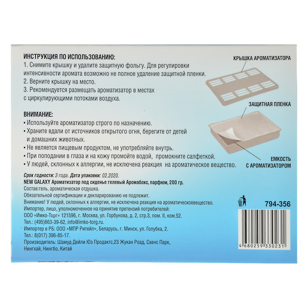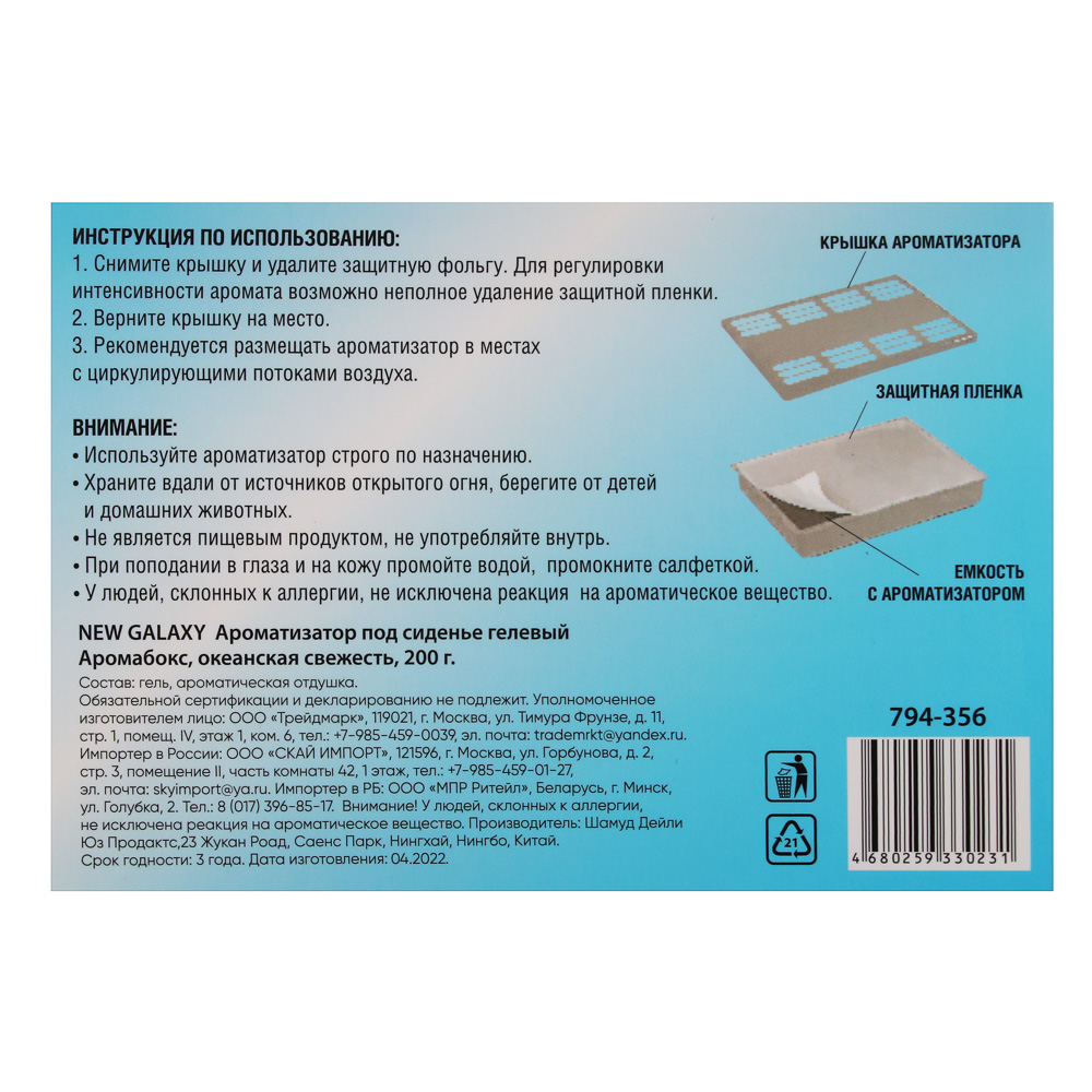 Ароматизатор в машину под сиденье NEW GALAXY «Аромабокс» с ароматом «Океанская свежесть» эффективно маскирует нежелательные запахи в салоне автомобиля, создавая ощущение чистоты и свежести. Не занимает много места, равномерно распределяет аромат по всему салону и экономично расходуется. Для регулировки интенсивности аромата возможно неполное удаление защитной пленки.