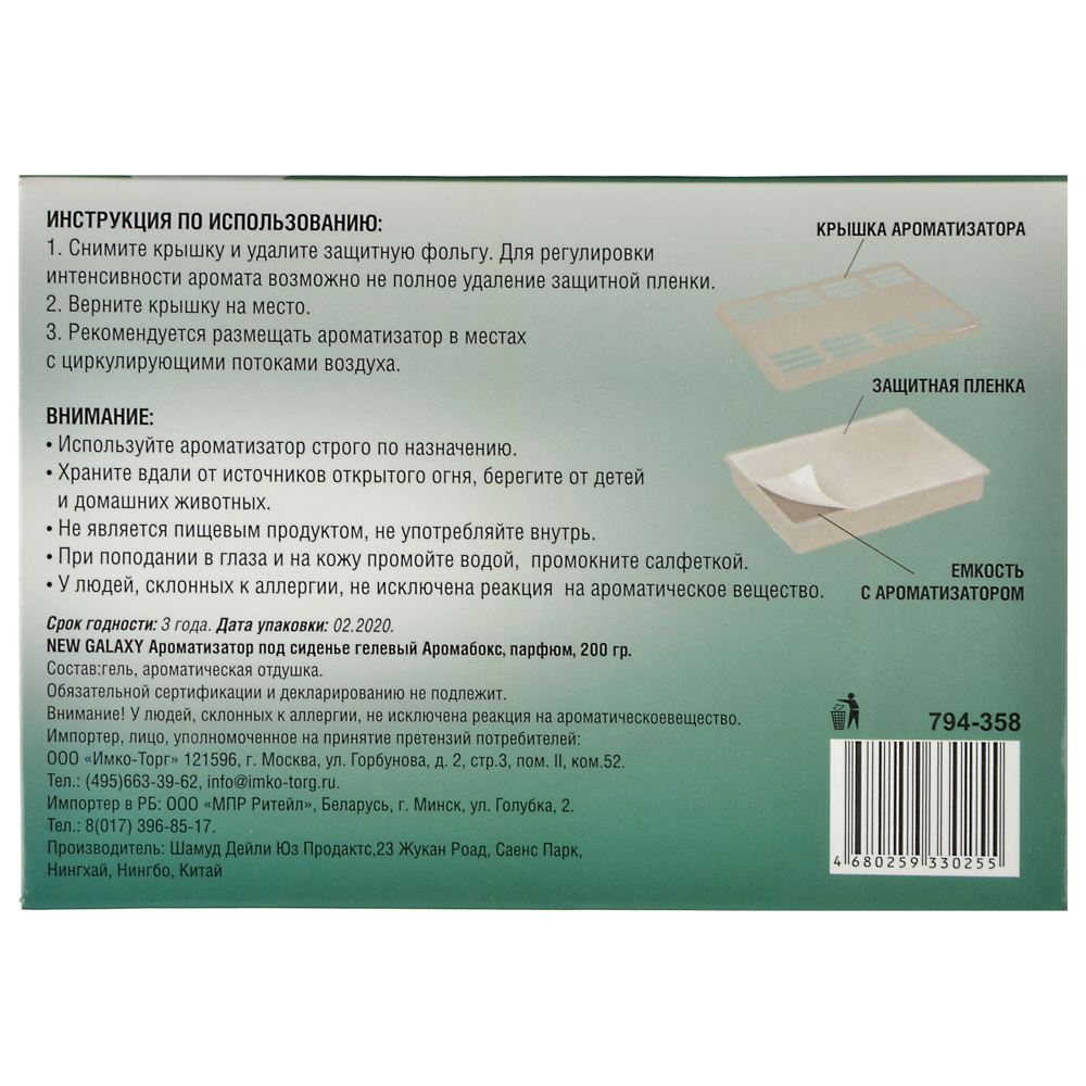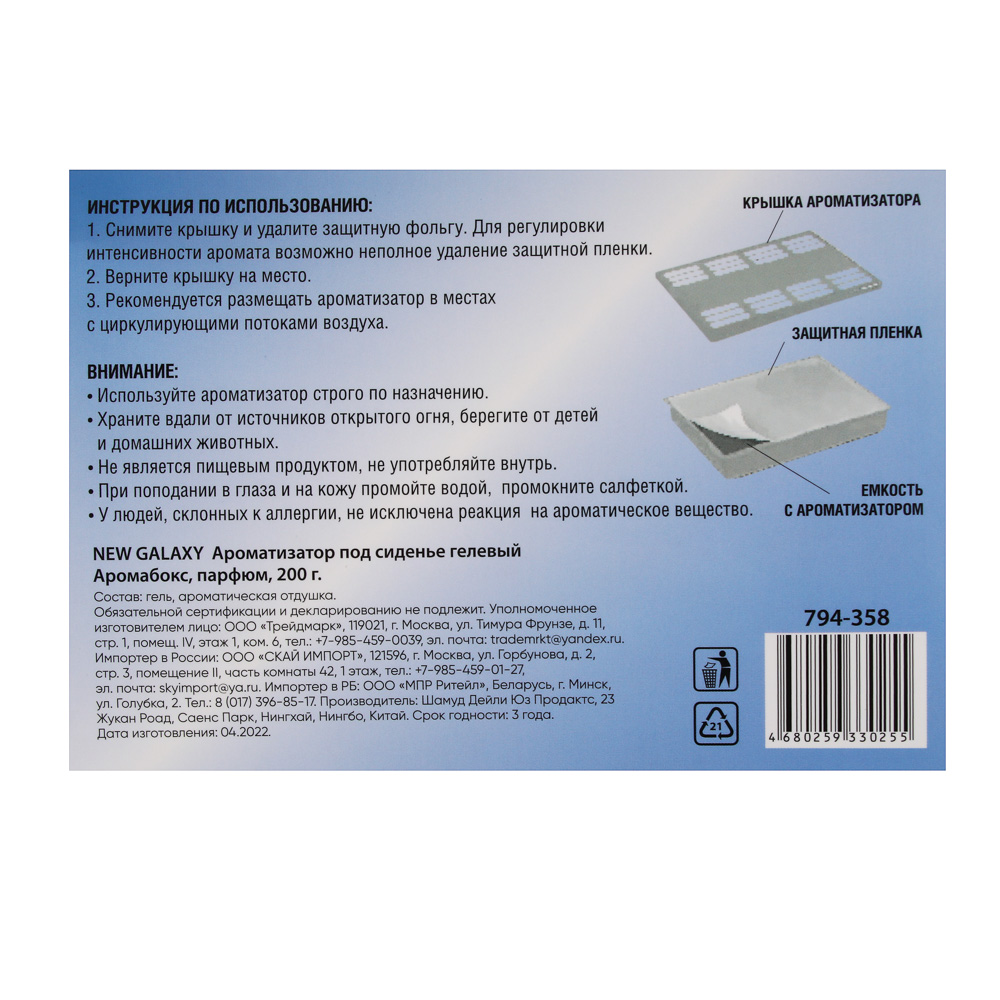 Гелевый ароматизатор в машину под сиденье NEW GALAXY «Аромабокс» с ароматом «Парфюм» создаст особую атмосферу в салоне автомобиля. Приятная ненавязчивая парфюмерная композиция освежит воздух и избавит от неприятных запахов. Экономично расходуется, а степень насыщенности аромата можно регулировать путем неполного вскрытия защитной пленки.