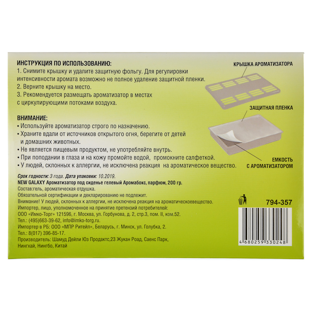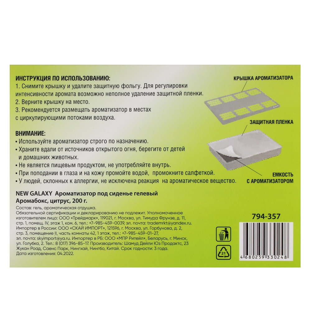 Гелевый ароматизатор в машину под сиденье NEW GALAXY «Аромабокс» с ароматом цитруса – это компактный блок, который не займет много места в салоне, освежит воздух и наполнит пространство ярким бодрящим ароматом цитруса. Ароматизатор постепенно испаряется, имеет ненавязчивый запах, а степень интенсивности аромата можно регулировать неполным удалением защитной пленки. Отлично маскирует нежелательные запахи.