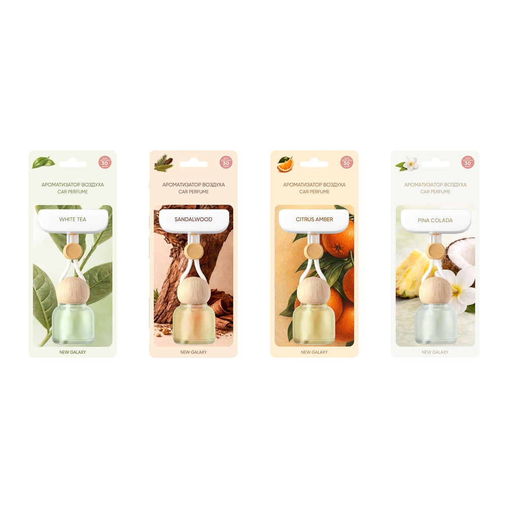 Подвесной ароматизатор NEW GALAXY — компактный аксессуар для автомобиля, который помогает создать приятную и комфортную атмосферу в салоне. Жидкая ароматическая формула постепенно раскрывается, равномерно наполняя пространство мягким и стойким ароматом, не перегружая воздух. Благодаря удобному подвесному формату флакон легко размещается на зеркале заднего вида и гармонично вписывается в интерьер автомобиля. Он не мешает обзору и остаётся аккуратным элементом оформления салона. Ароматы представлены в ассортименте. Формула на основе ароматического масла и растворителя обеспечивает стабильное и длительное действие до 30 дней.