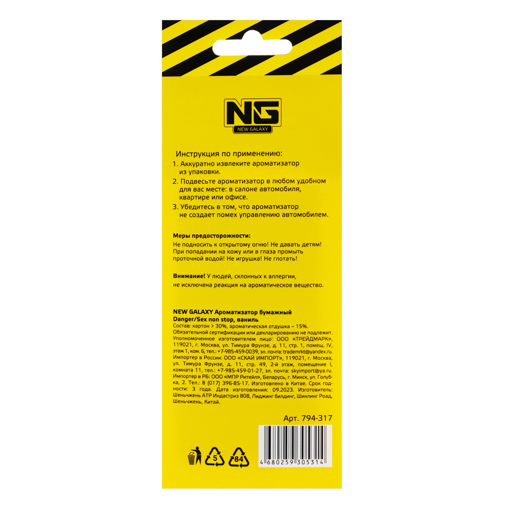 Автомобильный ароматизатор "Danger/Sex non stop" с ароматом ваниль выполнен из плотной бумаги и пропитан парфюмированым средством. В обиходе этот вид ароматизаторов еще называют "елочка". Такой освежитель воздуха может располагаться в любом месте машины и обеспечивать в салоне приятный аромат и нейтрализацию посторонних запахов на длительное время.