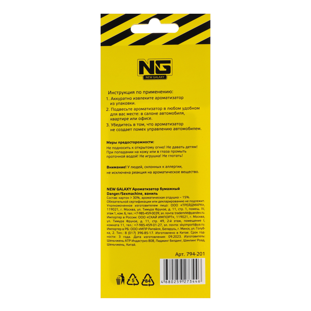 Автомобильный ароматизатор "Danger/Sexmachine" с ароматом ваниль выполнен из плотной бумаги и пропитан парфюмированым средством. В обиходе этот вид ароматизаторов еще называют "елочка". Такой освежитель воздуха может располагаться в любом месте машины и обеспечивать в салоне приятный аромат и нейтрализацию посторонних запахов на длительное время.