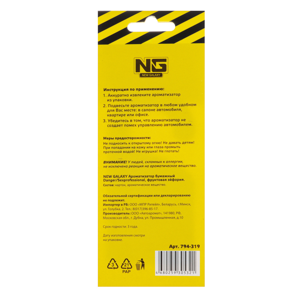 Автомобильный ароматизатор "Danger/Sexprofessional" с ароматом фруктовая эйфория выполнен из плотной бумаги и пропитан парфюмированым средством. В обиходе этот вид ароматизаторов еще называют "елочка". Такой освежитель воздуха может располагаться в любом месте машины и обеспечивать в салоне приятный аромат и нейтрализацию посторонних запахов на длительное время.