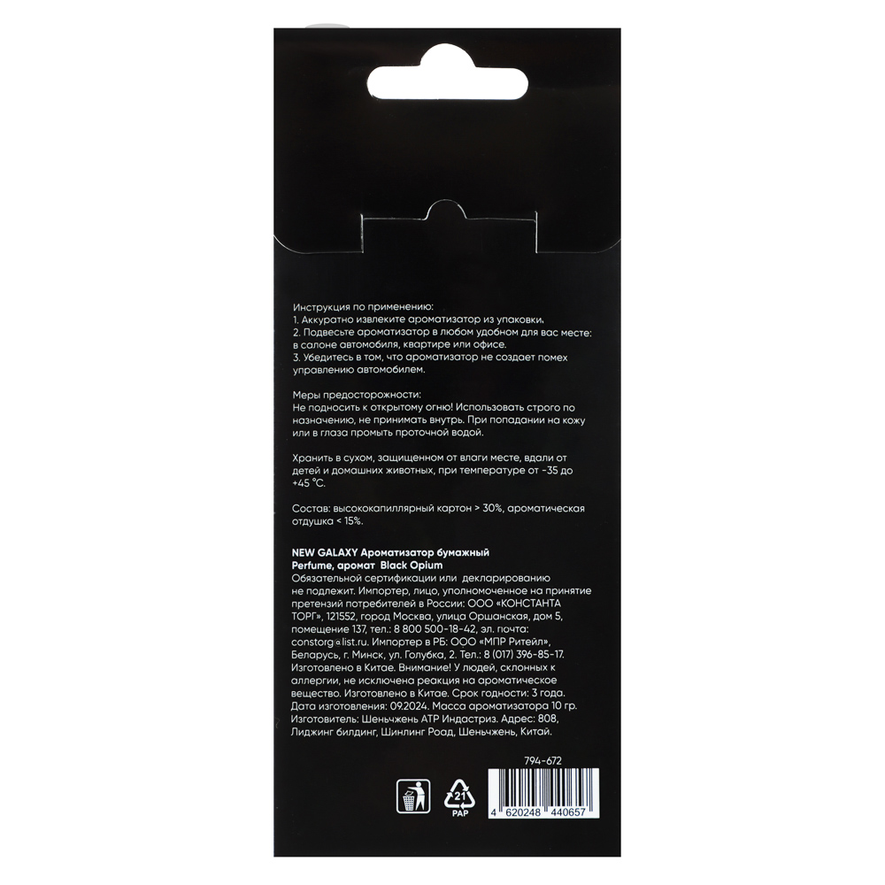 Бумажный ароматизатор в машину NEW GALAXY «Perfume», аромат «Black Opium» подвесного типа предназначен для установки на зеркало заднего вида. Глубокий парфюмерный аромат с нотами апельсина, розового перца, кедра и пачули создает роскошную атмосферу, гармонично дополняя дизайн автомобильного салона. Компактный аксессуар не создает помех во время управления автомобилем. Подходит для использования в офисе или в квартире.