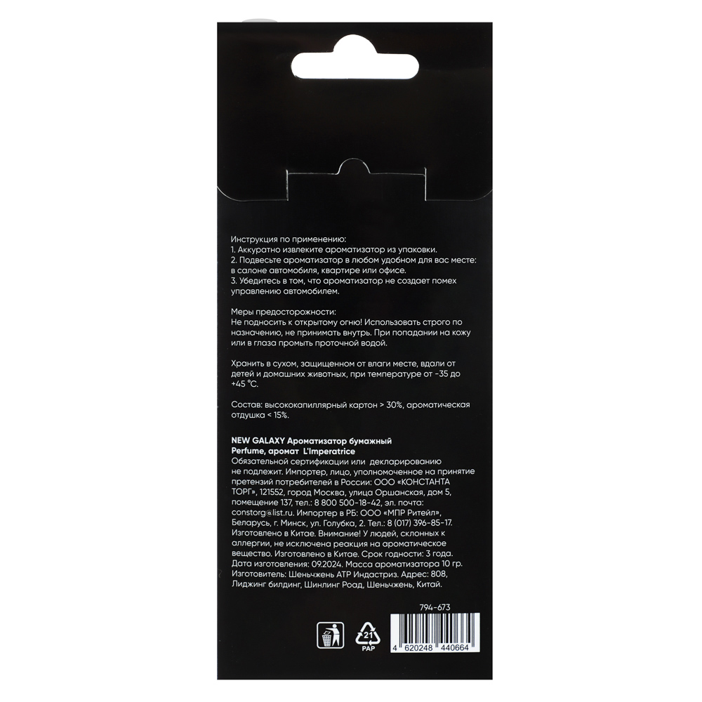 Ароматизатор бумажный NEW GALAXY «Perfume» с ароматом L’Imperatrice — идеальный выбор для вашего автомобиля! Он имеет стильный чёрный дизайн и изготовлен из высококачественного высококапиллярного картона, который равномерно распределяет аромат по салону. Благодаря этому аромату люксовой парфюмерии, ваш автомобиль наполнится особой атмосферой. Веревочка для крепления не мешает обзору во время движения, а также позволяет использовать ароматизатор в квартире или офисе. Наслаждайтесь приятным запахом каждый день!