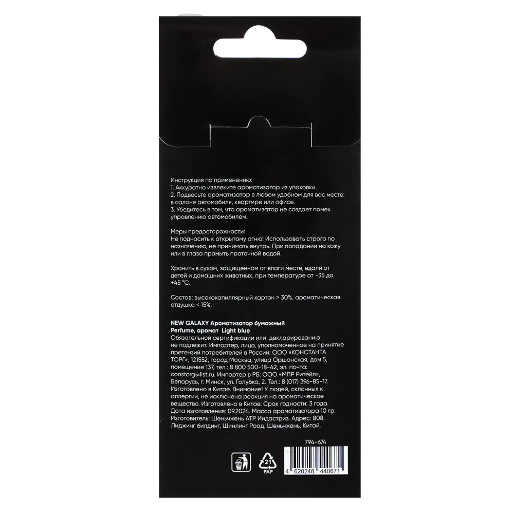 Ароматизатор бумажный NEW GALAXY «Perfume» с ароматом Light blue — идеальный выбор для вашего автомобиля! Он имеет стильный чёрный дизайн и изготовлен из высококачественного высококапиллярного картона, который равномерно распределяет аромат по салону. Благодаря этому аромату люксовой парфюмерии, ваш автомобиль наполнится особой атмосферой. Веревочка для крепления не мешает обзору во время движения, а также позволяет использовать ароматизатор в квартире или офисе. Наслаждайтесь приятным запахом каждый день!