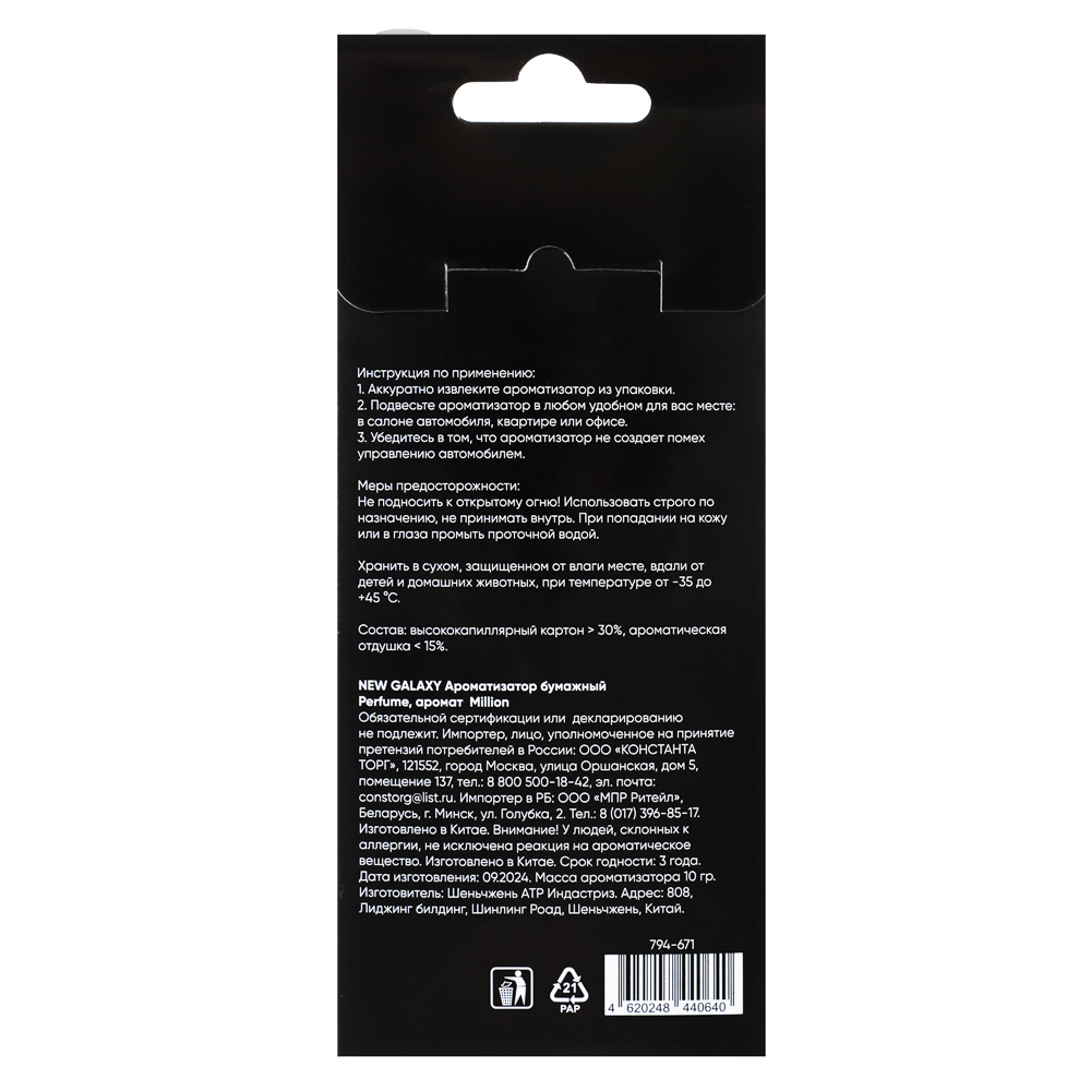 Бумажный ароматизатор в машину NEW GALAXY «Perfume», аромат «Million» на зеркало заднего вида имеет строгий лаконичный дизайн черного цвета из высококапиллярного картона, который медленно и равномерно распределяет ароматическую композицию по всей площади автомобильного салона. Аромат люксовой парфюмерии создает особую атмосферу в салоне. Ароматизатор на веревочке не мешает обзору во время езды. Также подходит для использования в квартире или в офисе.