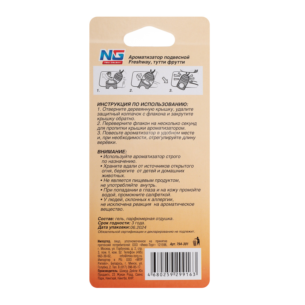 Подвесной ароматизатор в машину NEW GALAXY «FRESHWAY» с ароматом Тутти Фрутти особенно придется по душе автоледи. Флакон имеет стильный деревянный корпус с прозрачным окошком и шнурок, который легко можно отрегулировать по длине. Ароматизатор наполнит салон автомобиля ярким ароматом, который подарит хорошее настроение во время поездки.