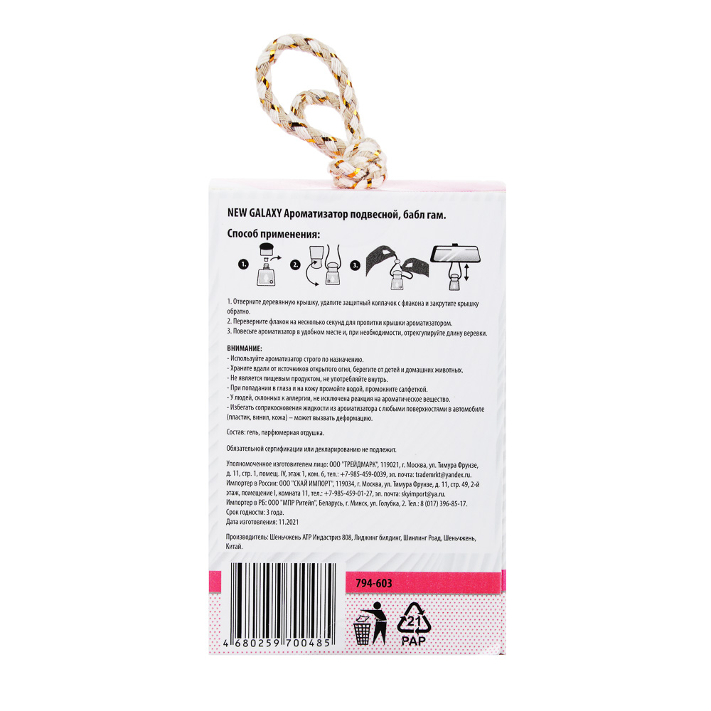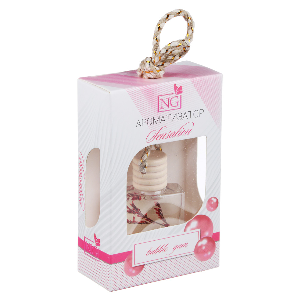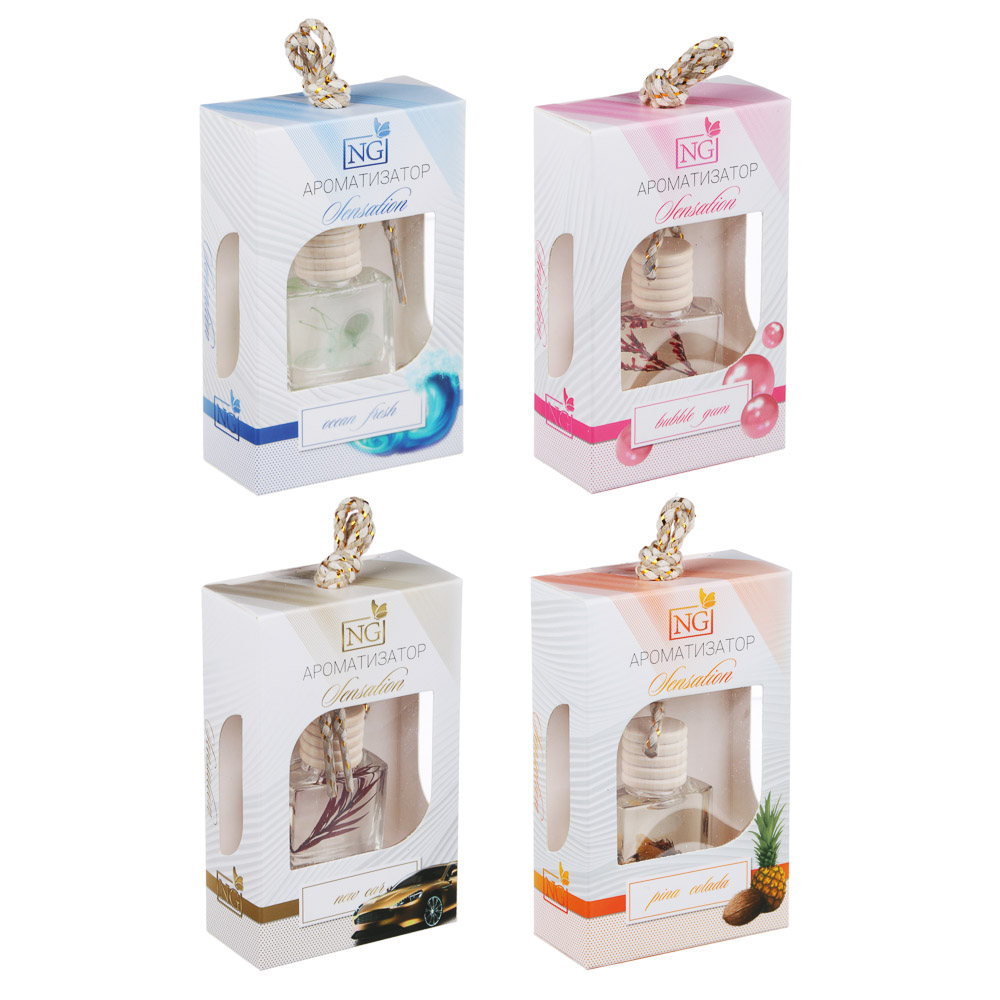 Подвесной ароматизатор NEW GALAXY «Sensation» – это универсальный освежитель воздуха для автомобиля, жилых помещений, гардеробов, ванной комнаты или офиса. Флакон имеет элегантный дизайн с декором внутри, который дополнит интерьер помещения или салона машины. Крепится на зеркало заднего вида или перекладину при помощи шнурка, а также его можно поставить на горизонтальную поверхность. Имеет экономичный расход. 4 аромата в ассортименте: бабл гам, пина колада, новая машина, свежесть океана.