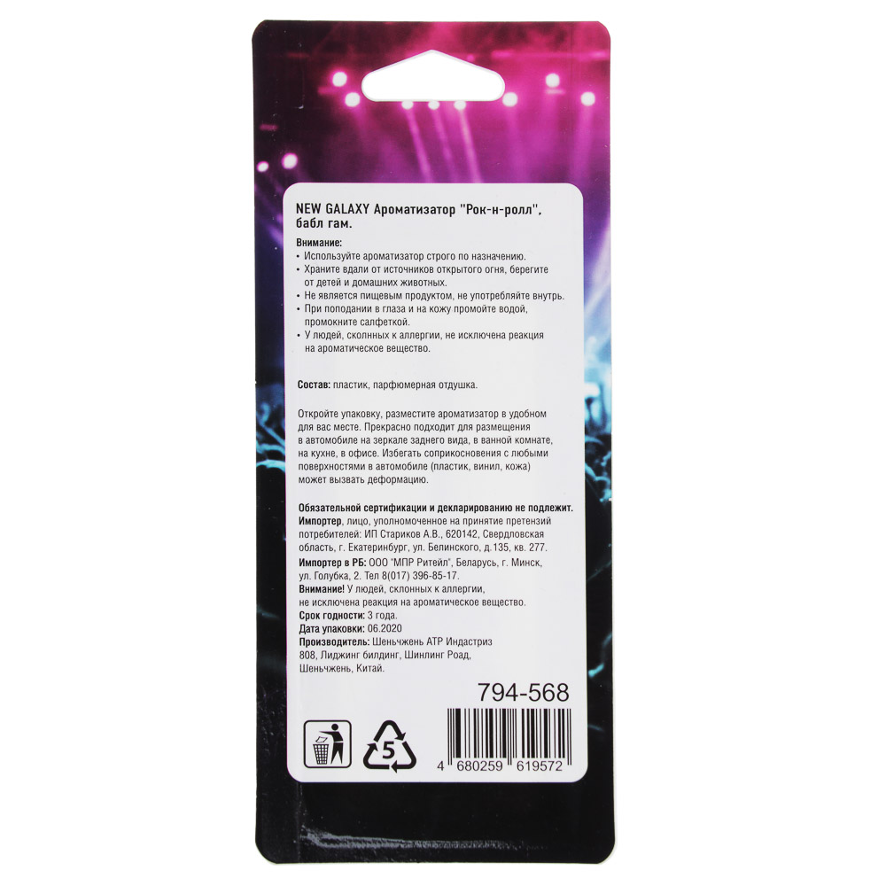 Автомобильный ароматизатор New Galaxy "Рок-н-ролл" быстро и эффективно устранит неприятные запахи в вашем автомобиле и придаст легкий приятный аромат. В обиходе этот вид ароматизаторов еще называют "елочка". Такой освежитель воздуха может располагаться в любом месте машины и обеспечивать в салоне приятный аромат и нейтрализацию посторонних запахов на длительное время. В ассортименте.
