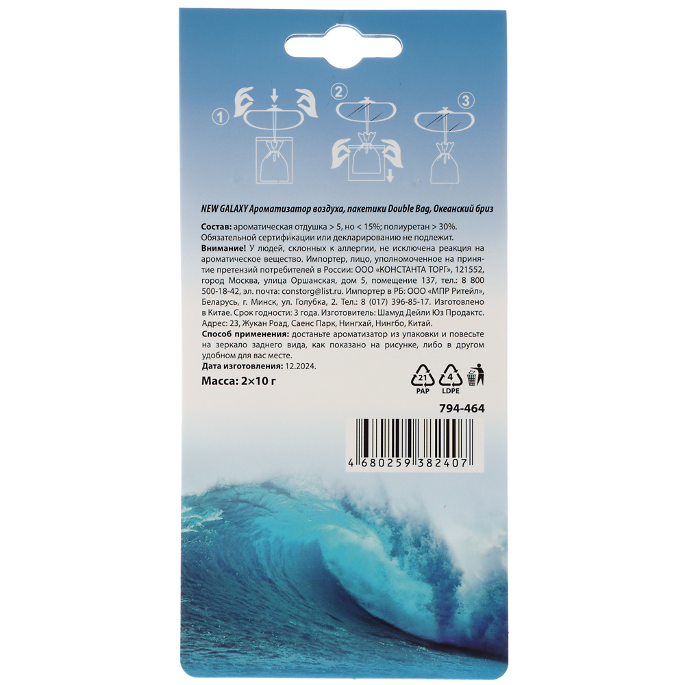 Гелевый ароматизатор в машину "Double Bag" с ароматом океанский бриз эффективно нейтрализует неприятные запахи и создает в комнате комфортную атмосферу для отдыха и работы. Секрет изделия кроется в гелевом наполнителе, который медленно испаряется и наполняет помещение чудесным запахом.