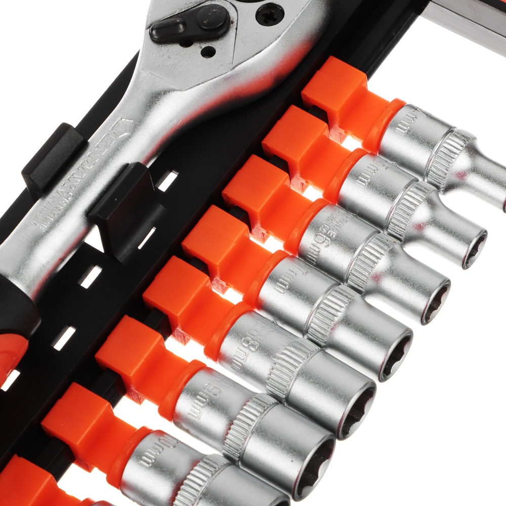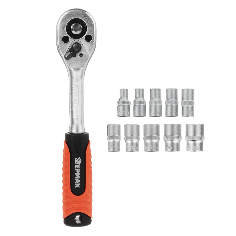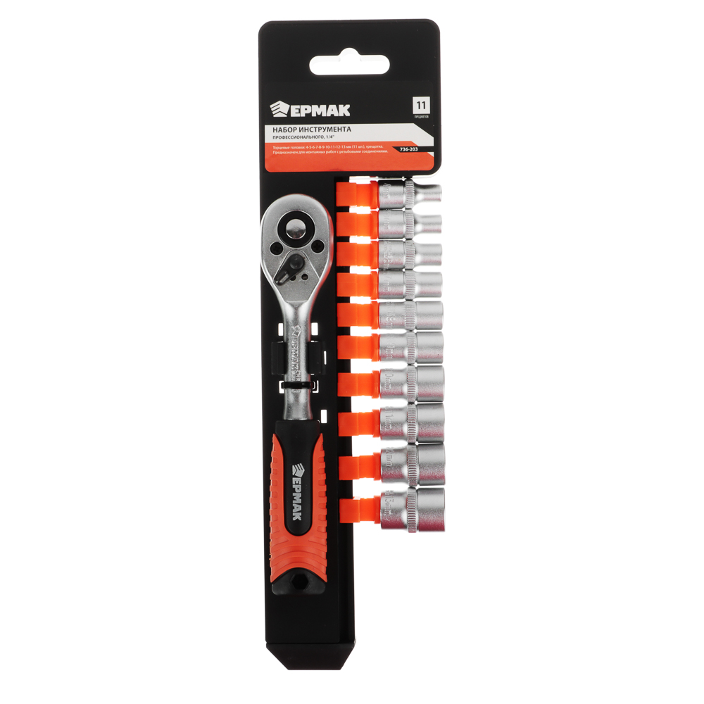 Набор профессионального инструмента ЕРМАК из 11 предметов 1/4" включает трещотку и головки разных размеров. Трещоточный ключ с эргономичной прорезиненной ручкой обеспечивает удобный хват, а механизм-трещотка позволяет быстро раскручивать и закручивать крепежи. Смена головки происходит легко и быстро. Головки надежно фиксируются на ключе и изготовлены из качественного хромванадиевой стали, стойкой к износу.