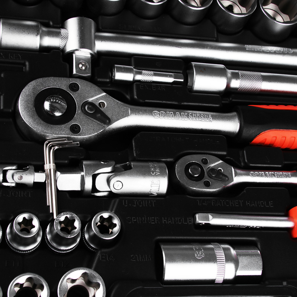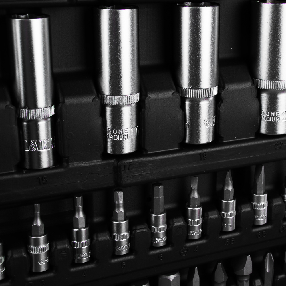 Отверточные торцевые головки 1/4" (18шт.): TORX: T8-T10-T15-T20-T25-T27-T30; PH: 1-2; PZ: 1-2 HEX: 3-4-5-6мм; Slotted: 4-5,5-6,5мм