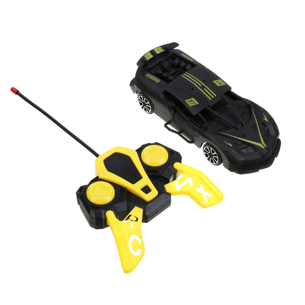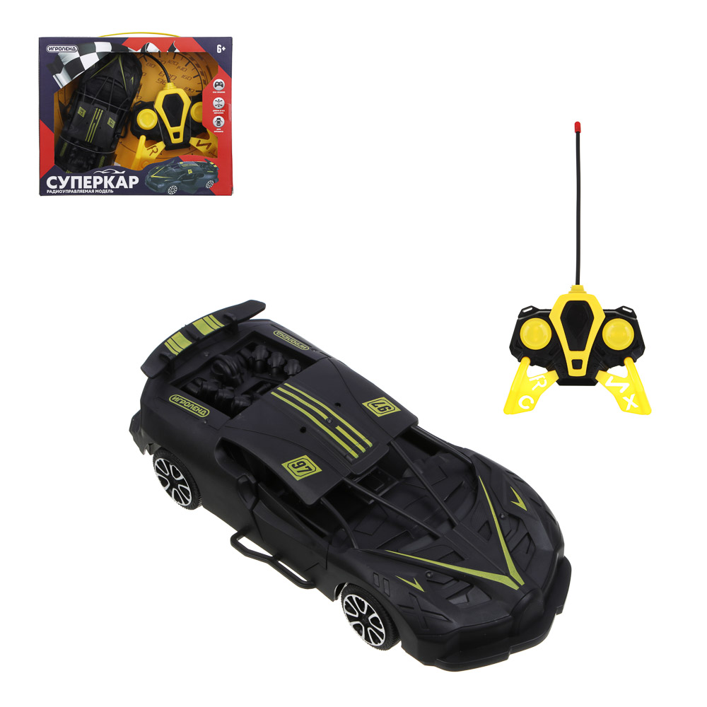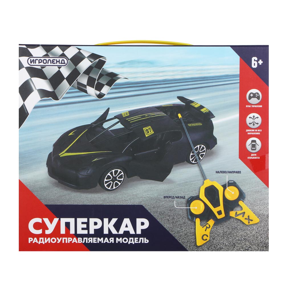 Машина на радиоуправлении ИГРОЛЕНД "Суперкар", размер 27х22х6,6 см – это мощный и маневренный радиоуправляемый автомобиль, который станет замечательным подарком для мальчика на любой праздник. Имеет стильный реалистичный дизайн в черном цвете с яркими желтыми или красными элементами, а также открывающиеся двери и качественный прочный корпус из полипропилена. Быстро разгоняется, движется во всех направлениях, легко управляется при помощи джойстика. Для работы потребуется 5 батареек АА-типа. Доступно 3 дизайна. Рекомендуемый возраст ребенка – от 6 лет.
