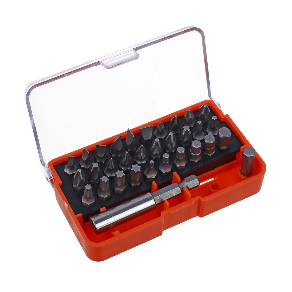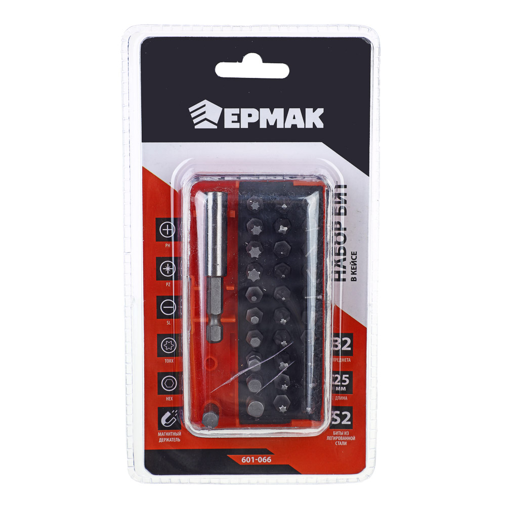 Биты для шуруповерта ЕРМАК длиной 25 мм предназначены для работы с резьбовыми соединениями разных типов. Комплект включает 32 биты разных размеров следующих разновидностей: PH1, PZ, SL1, PH2, SL2. Изготовлены из легированной стали, имеющей высокий ресурс службы и повышенную устойчивость к деформации. Комплект также включает магнитный держатель с удлинителем для работы с соединениями, находящимися в труднодоступных местах. Пластиковый кейс удобен для переноски и хранения, а также оснащен пластиковой клипсой для крепления на кармане рабочей одежды или вертикального хранения.