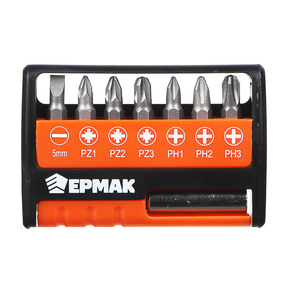 Набор бит для шуруповерта с магнитным держателем ЕРМАК предназначен для работы с шурупами и винтами. Включает 7 бит, изготовленных из высококачественной легированной стали S2 с повышенной твердостью 58-60 HRC, а также удлинитель с держателем для бит. Набор содержит биты со следующими типами шлицев: плоский 5 мм, PZ1, PZ2, PZ3, PH1, PH2, PH3. В комплект также включен компактный пластиковый кейс для хранения с маркировкой бит. Длина бит - 25 мм.