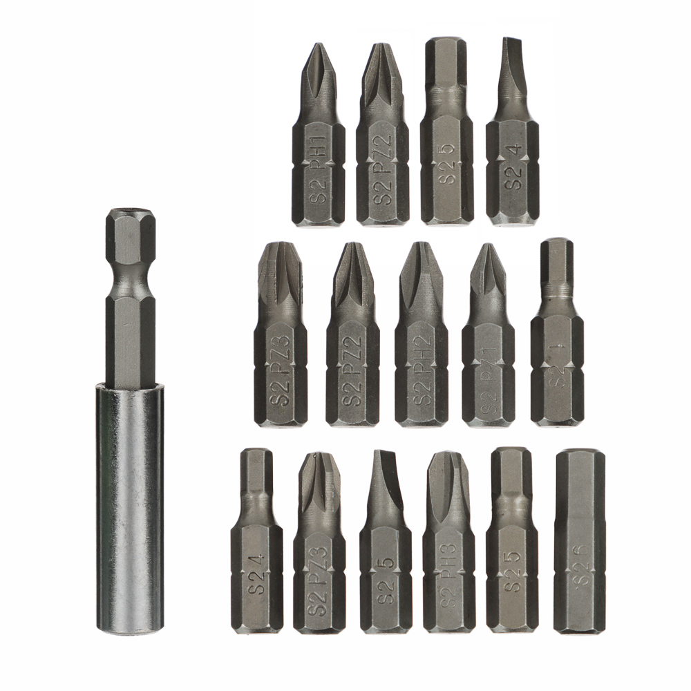 Набор бит на блистере ЕРМАК Набор бит 16 предметов состоит из 16 элементов для работы с шуруповёртами и дрелями. В комплект входят 15 бит длиной 25 мм и магнитный адаптер длиной 60 мм, который обеспечивает удобное удержание бит во время работы. Прочные материалы гарантируют долговечность и надёжность при закручивании и выкручивании крепежа. Компактная блистерная упаковка облегчает хранение и транспортировку, делая набор удобным для домашнего и профессионального использования.