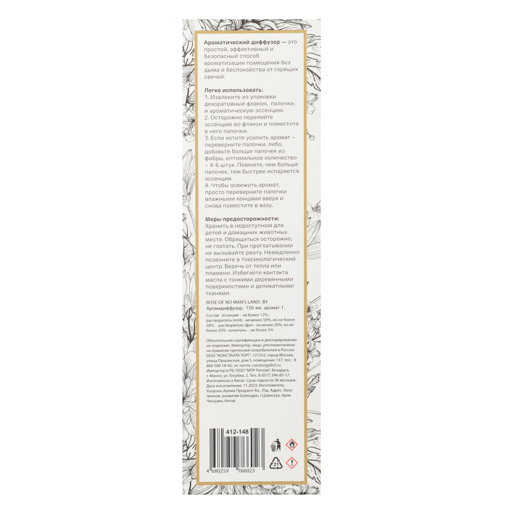 Аромадиффузор BY 150 мл с ароматом «ROSE OF NO MENS LAND» имеет глубокий душистый и одновременно нежный цветочный аромат пиона, который ассоциируется с благоуханием летнего сада. Поднимет настроение, подарит спокойствие, настроит на комфортный отдых, а также поможет создать гармоничную атмосферу в доме. Комплект в подарочной упаковке включает флакон, ароматическую композицию, декор и палочки. Станет приятным подарком для девушки. Верхние ноты: розовый перец, розы. Средние ноты: роза, малина. Задние ноты: древесный аромат, папирус, янтарь, мускус, слюна.