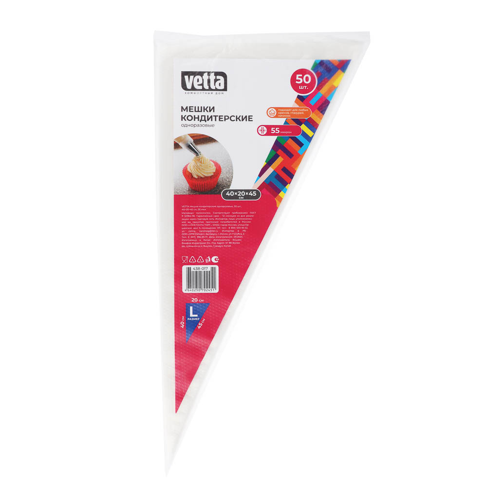 Кондитерские мешки - отличный помощник на кухне, подходят для работы с кремом, глазурью, шоколадом и т.п. Если вы часто балуете близких тортами и различными десертами с кремом, то вам просто необходим кондитерский мешок. Кондитерские мешки универсальны, их можно использовать с любыми кондитерскими насадками (уголок мешка обрезается под размер насадки). С помощью этого мешка 40x20x50 см украшение десертов доставит вам только удовольствие. Комплект состоит из 50 одноразовых пакетов.