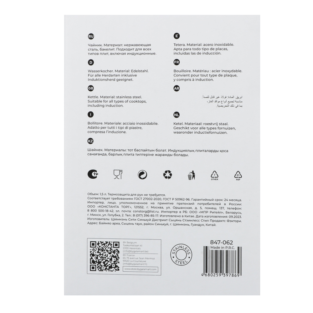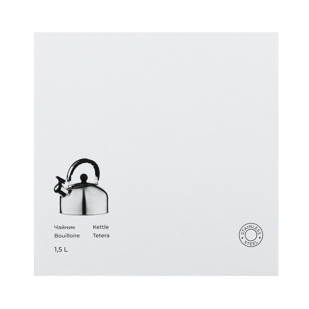 Чайник стальной 1,5 л серебряного цвета предназначен для использования на всех типах плит, включая индукционные. Модель оснащена свистком для оповещения о закипании. Ручка из термостойкого бакелита не нагревается во время использования. В комплектацию входит крышка. Чайник допускает мытьё в посудомоечной машине. Компактный объём 1,5 л подходит для приготовления горячих напитков для 1-2 человек. Корпус выполнен из нержавеющей стали. Сочетает классический дизайн с практичной функциональностью.