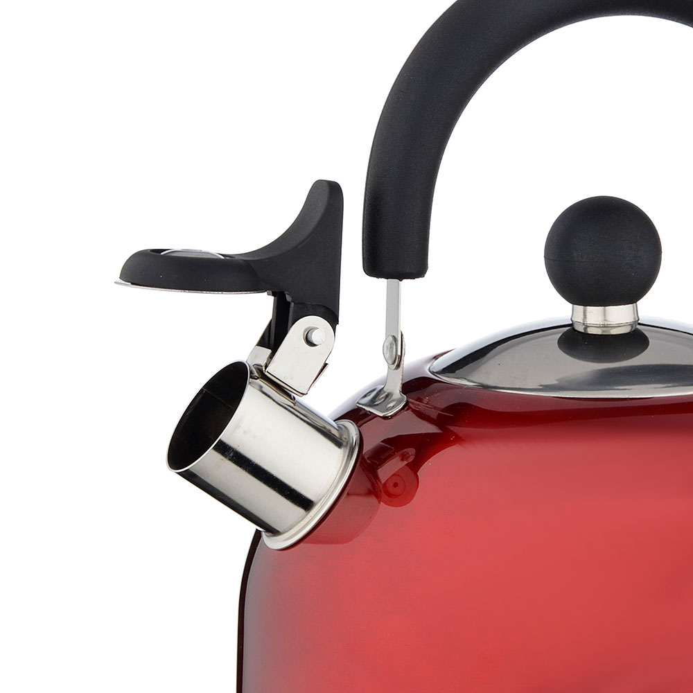 Чайник объемом 2,5 л изготовлен из нержавеющей стали, красного цвета, с несъемным свистком и бакелитовой ручкой черного цвета подходит для всех типов плит, включая индукцию.