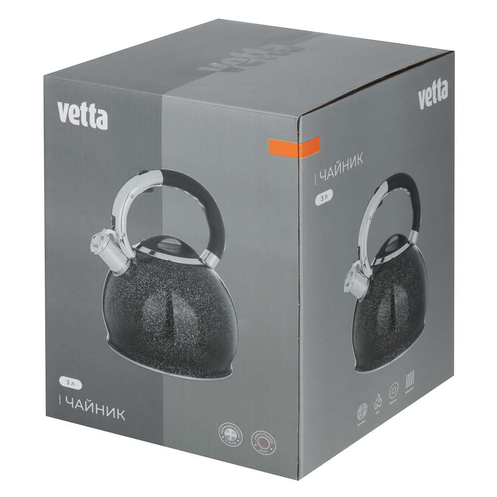 В поиске идеального чайника? Vetta Виттель станет вашим любимчиком с первой встречи. Благодаря капсульному дну, вода нагревается быстрее, экономя ресурсы и ваше время. Свисток не позволит забыть о чайнике на плите. Ненагревающаяся ручка не позволит обжечься. Трехлитровая емкость позволяет приготовить 6 стандартных кружек чая для членов семьи и друзей. 6 причин купить чайник из нержавеющей стали Vetta Виттель:• объем 3 литра — идеально для большой семьи; • капсульное дно обеспечивает быстрый равномерный нагрев;• материал — нержавеющая сталь;• подходит для всех типов плит, включая индукционную;• свисток сообщает, что пришло время пить чай;• покрытие ручки не нагревается, исключая ожоги.