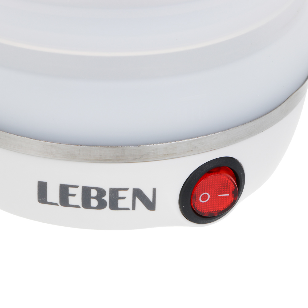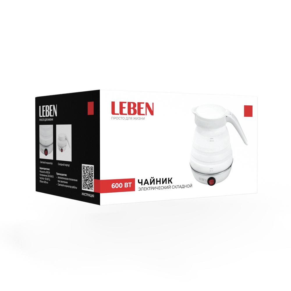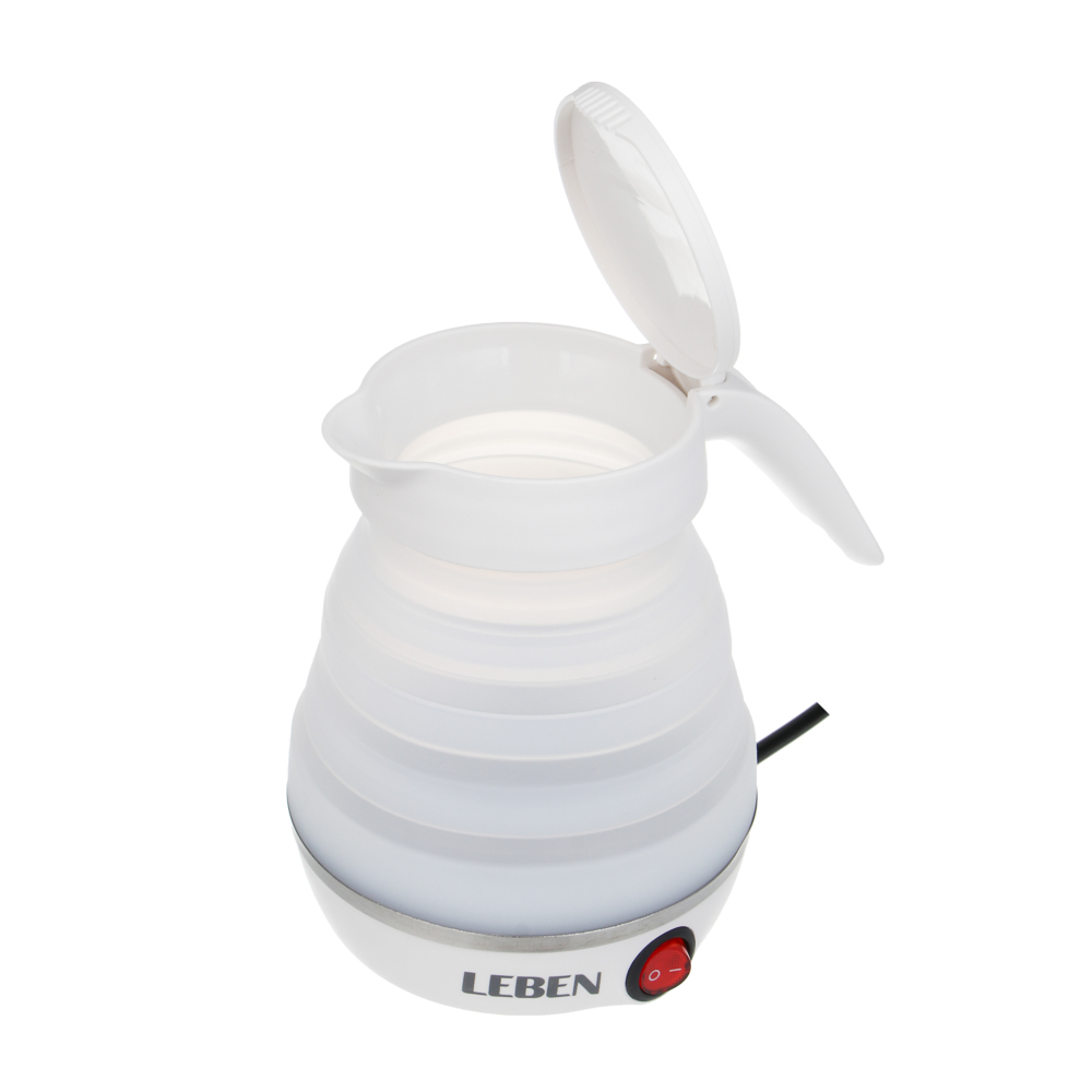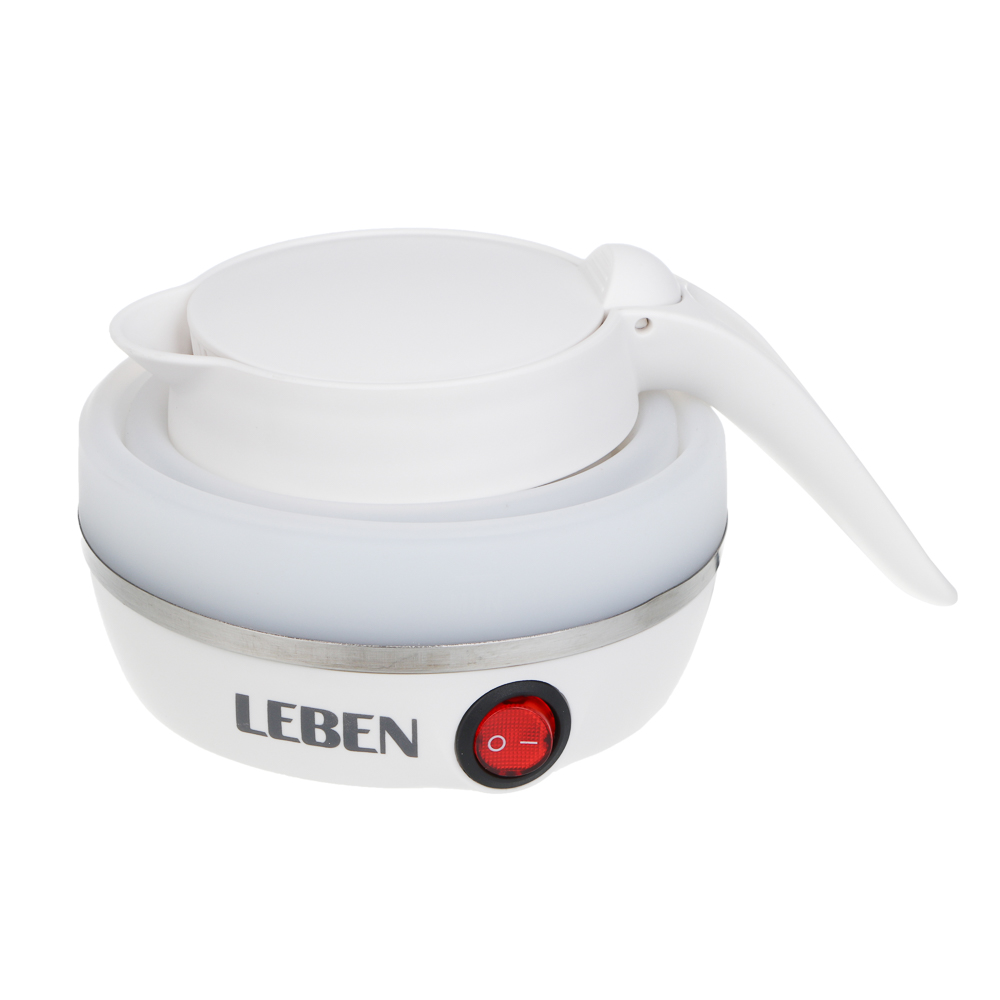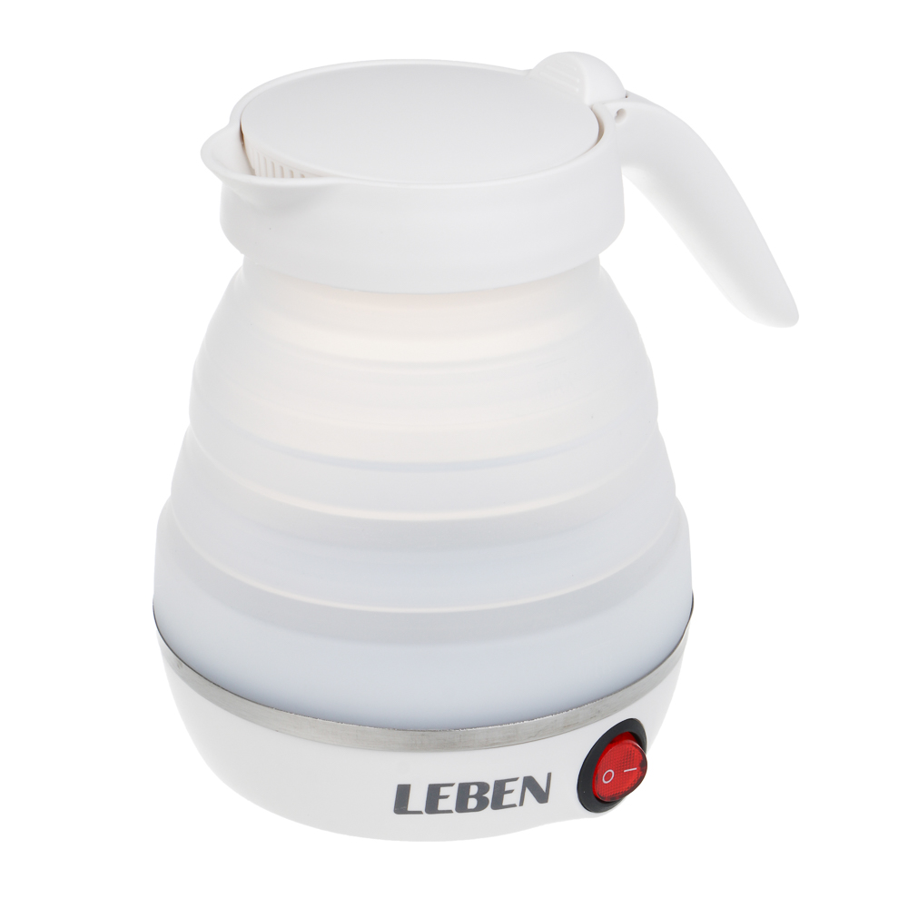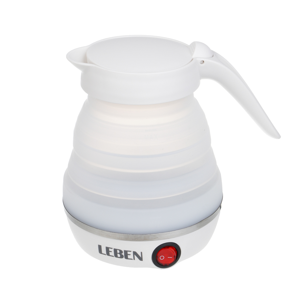 Электрический чайник LEBEN арт 600 мл — компактное и практичное решение для путешествий, командировок и использования в небольших пространствах. Благодаря складной конструкции чайник занимает минимум места, что делает его удобным для хранения и транспортировки. Модель выполнена из прочного силикона и пластика, устойчивых к нагреву и безопасных в эксплуатации. Объём 600 мл оптимален для быстрого кипячения воды на одну–две чашки. Мощность 600 Вт обеспечивает экономичное энергопотребление и стабильную работу от сети 220 В.Чайник оснащён функцией автоотключения, которая повышает безопасность использования и предотвращает перегрев. Классический белый цвет придаёт устройству аккуратный и универсальный внешний вид. Электрический чайник LEBEN сочетает мобильность, функциональность и надёжность, делая его удобным помощником в дороге и дома.