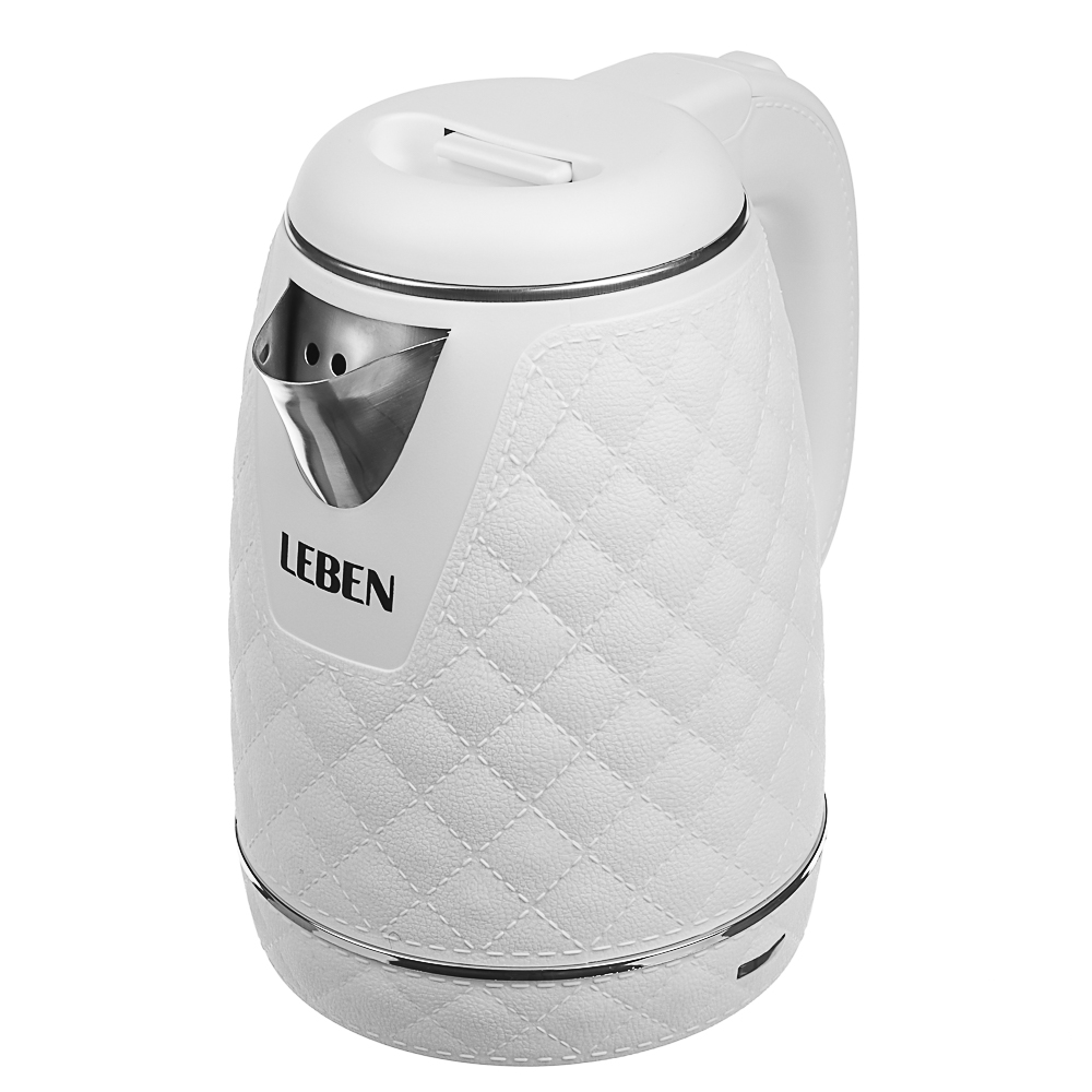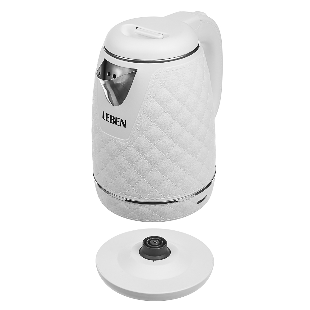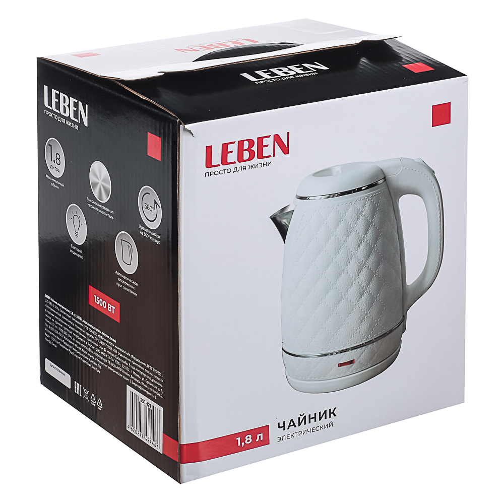 Электрический чайник Leben — это стильный и функциональный прибор для кипячения воды. Он имеет объём 1,8 литра и мощность 1500 Вт, что позволяет быстро нагреть воду. Корпус чайника выполнен из нержавеющей стали и пластика, что обеспечивает долговечность и устойчивость к коррозии. Белый цвет придаёт изделию элегантный вид. Автоматическое отключение при закипании гарантирует безопасность использования. Световой индикатор работы информирует о том, что чайник находится в рабочем состоянии. Поворот корпуса на 360 градусов делает его удобным в использовании. Этот электрический чайник станет незаменимым помощником на кухне и позволит наслаждаться горячим чаем или кофе в любое время.