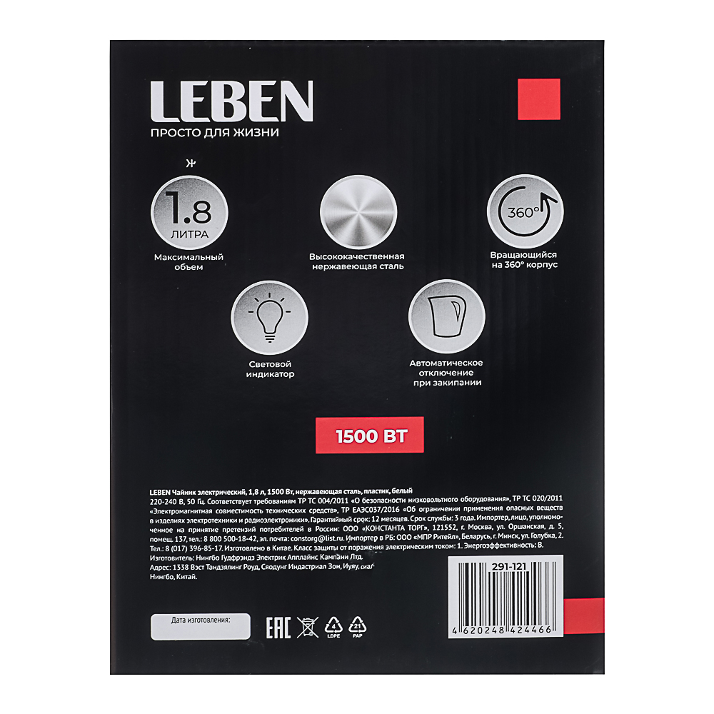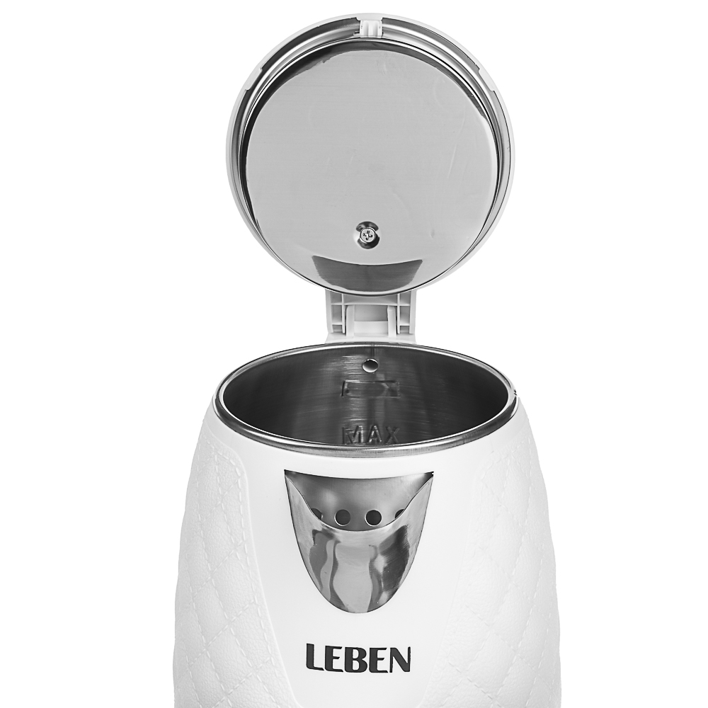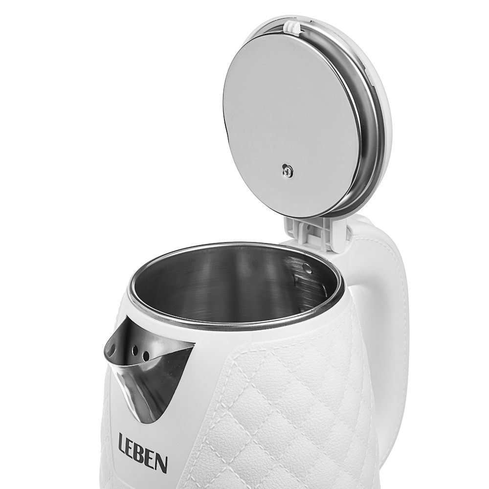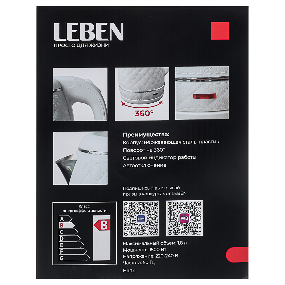 Электрический чайник Leben — это стильный и функциональный прибор для кипячения воды. Он имеет объём 1,8 литра и мощность 1500 Вт, что позволяет быстро нагреть воду. Корпус чайника выполнен из нержавеющей стали и пластика, что обеспечивает долговечность и устойчивость к коррозии. Белый цвет придаёт изделию элегантный вид. Автоматическое отключение при закипании гарантирует безопасность использования. Световой индикатор работы информирует о том, что чайник находится в рабочем состоянии. Поворот корпуса на 360 градусов делает его удобным в использовании. Этот электрический чайник станет незаменимым помощником на кухне и позволит наслаждаться горячим чаем или кофе в любое время.