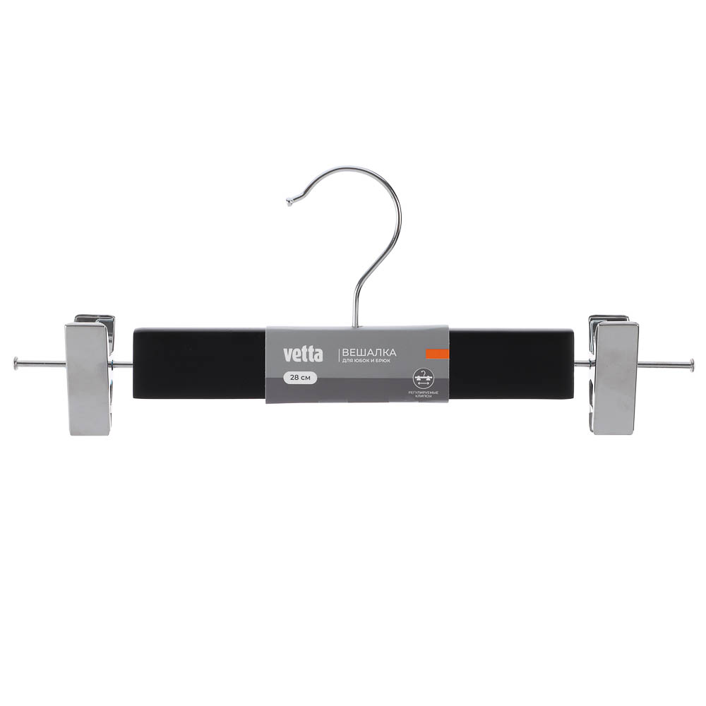 Вешалка для юбок и брюк VETTA длиной 28 см с удобными зажимами позволяет хранить одежду аккуратно, без складок и заломов. Прочный металлический каркас с хромированным покрытием обеспечивает долговечность и надёжность, а чёрный цвет придаёт вешалке элегантный и современный вид. Надёжные зажимы удерживают юбки, брюки и шорты на месте, делая хранение одежды удобным и практичным.