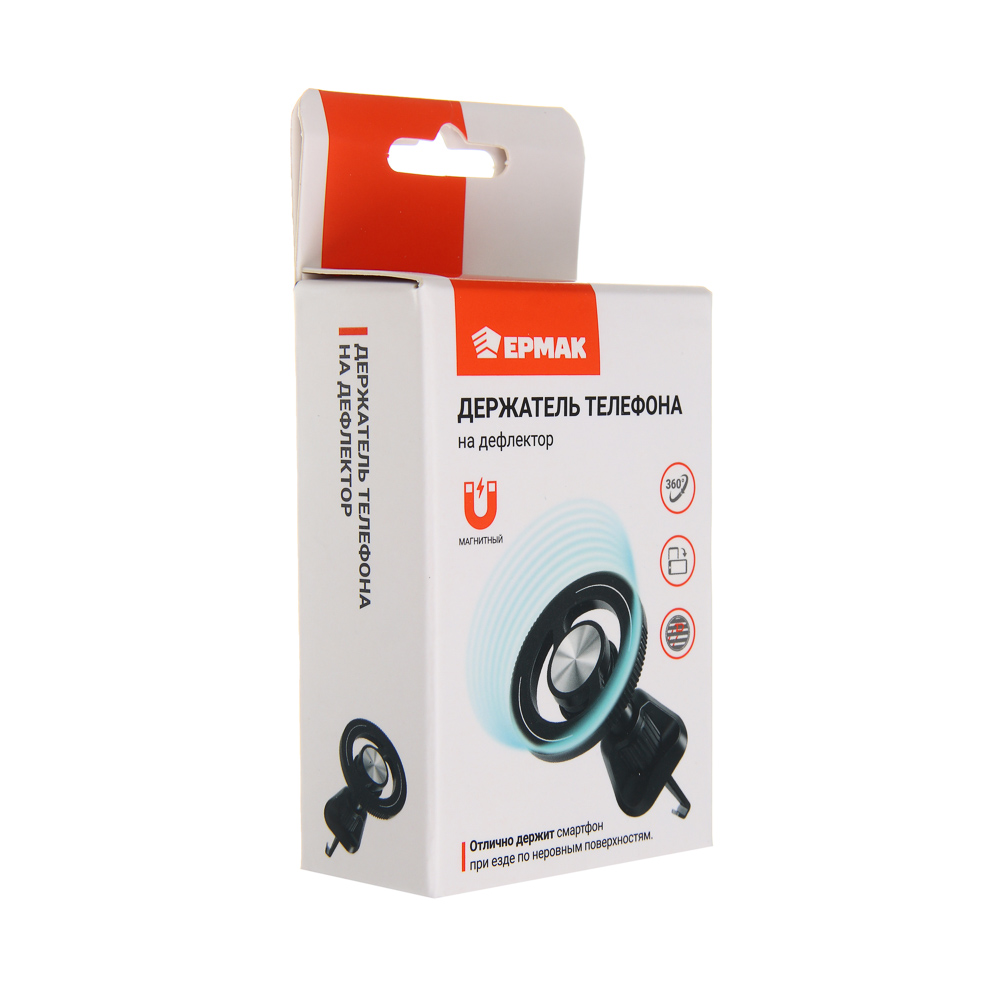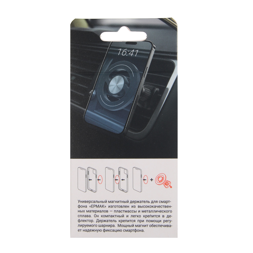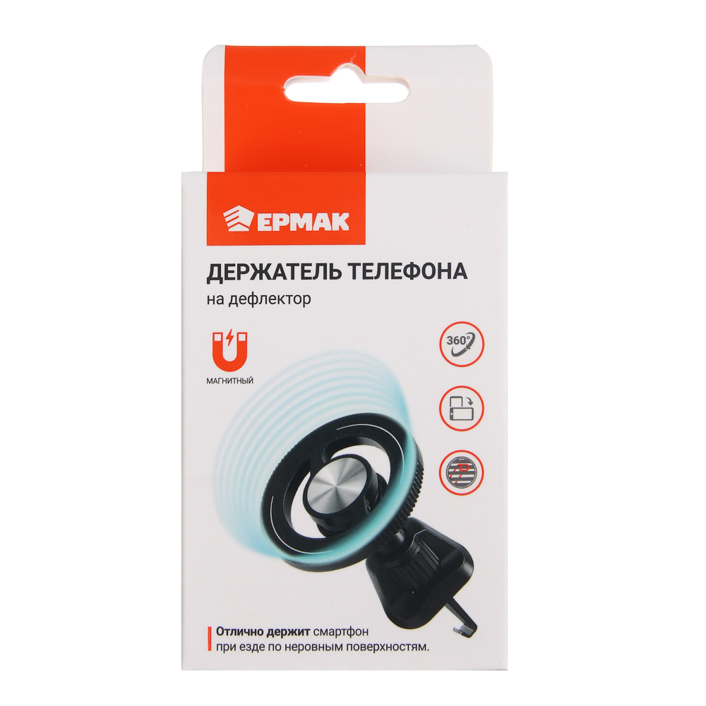 Магнитный держатель ЕРМАК предназначен для удобного и безопасного размещения смартфона в автомобиле. Крепление на дефлектор обеспечивает быструю установку без использования инструментов и не занимает место на панели. Надёжный магнит удерживает устройство даже при движении по неровной дороге. Поворотный механизм на 360° позволяет выбрать оптимальный угол обзора. Корпус из металла и пластика отличается прочностью и долговечностью, а лаконичный круглый дизайн гармонично вписывается в интерьер автомобиля.