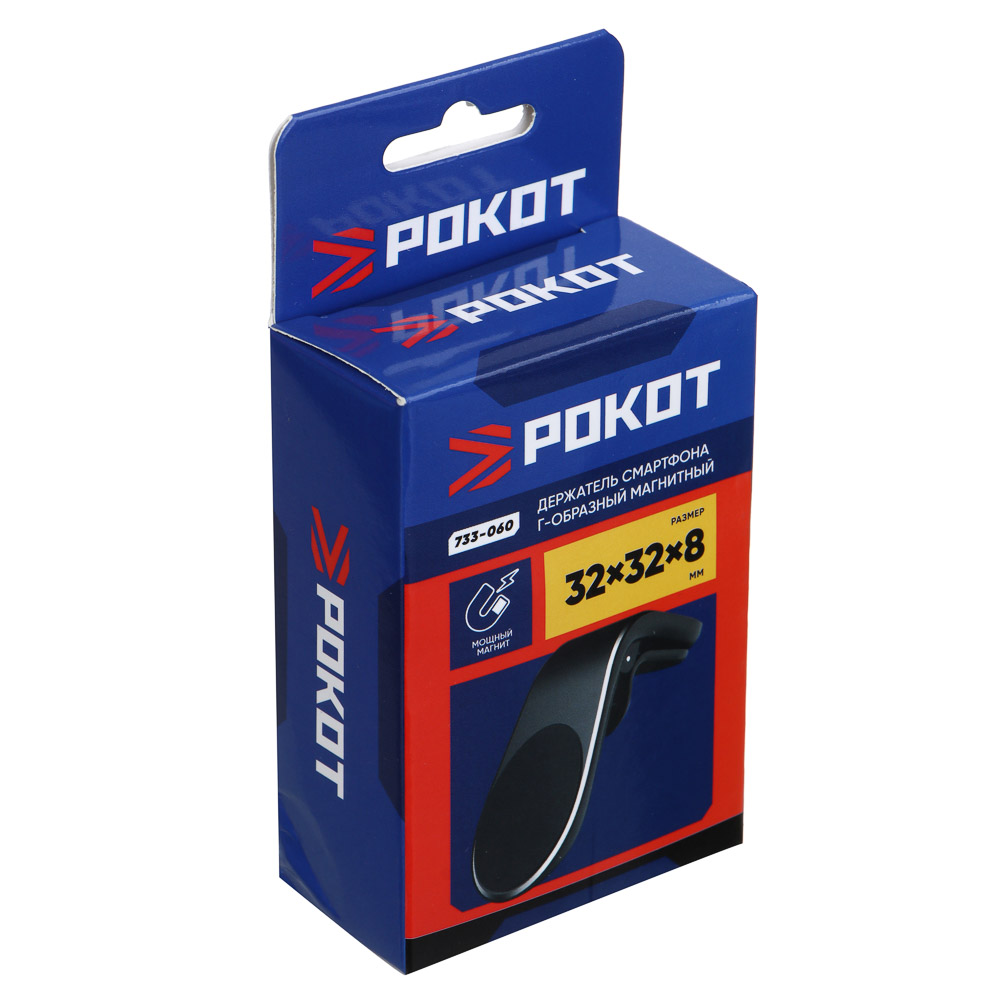 Г-образный магнитный держатель для смартфона на дефлектор от РОКОТ изготовлен из высококачественных материалов — пластика и металла. Он имеет компактный размер 3,2 х 3,2 х 0,8 см и легко крепится на дефлекторе автомобиля. Мощный магнит обеспечивает надёжную фиксацию смартфона. Чёрная расцветка позволяет ему гармонировать с интерьером любого автомобиля.
