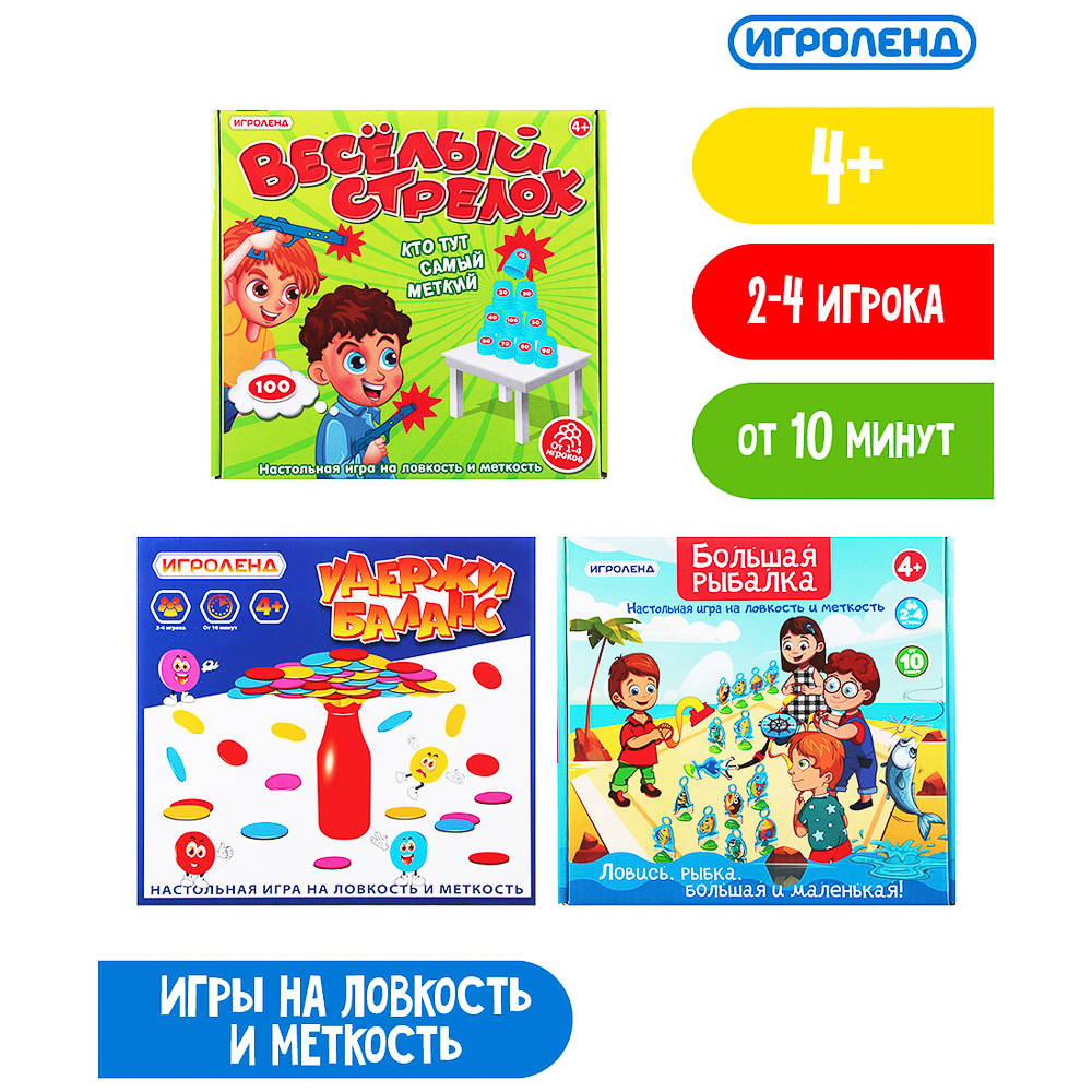 Игра "Удержи баланс". Цель игры - не разрушить пирамиду на бутылке и выстроить большее количество фишек. Состав: основа в виде бутылки, подставка для фишек, 80 разноцветных фишек. Настольная игра "Большая рыбалка". Тот, кто поймал больше всего рыбок (игрок или команда) - считается победителем. В наборе: основа-штурвал, рыболовный крючок, пояс с рукой - по 4 шт. , подставки с рыбками по 4 шт. Игра "Веселый стрелок". Игрок смотрит на барабан, как ему нужно стрелять - встает в указанную позу и стреляет по стаканчикам. Подсчитайте количество очков, согласно сбитым мишеням - у кого больше, тот победитель! Состав: барабан, 10 чашек-мишеней, набор фишек-очков, 4 пистолета, пакет резинок для стрельбы.Игры от ИГРОЛЕНД, развивающие и просто для радости — прекрасная возможность собрать компанию детей и сделать так, чтобы они захотели встретиться ещё. Также игры развивают у ребенка ловкость, гибкость, глазомер и прочие моторные навыки.