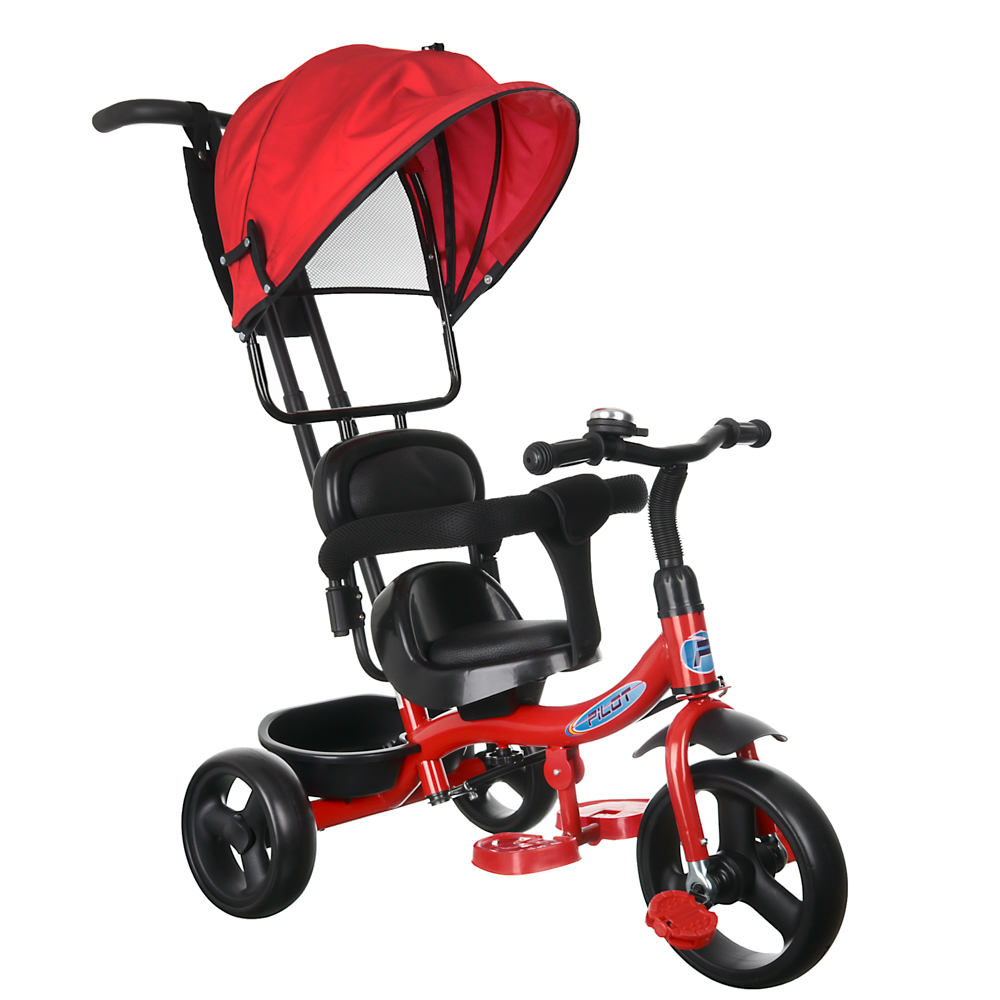 Велосипед трехколесный детский красного цвета с ручкой – удобный и безопасный прогулочный транспорт для ребенка в сопровождении взрослого. Малыш будет с удовольствием кататься на нем и станет полноценной заменой летней коляске. В нем все продумано до мелочей: • Имеет комфортное регулируемое сиденье со страховкой от падения. • Предусмотрены две пары педалей – зафиксированные и подвижные, а также руль с гудком и ручка сзади с регулировкой по высоте. Таким образом, велосипедом может управлять как ребенок, так и родитель. • Подвижный козырек защитит от солнца и дождя. • Сумка на ручке предназначена для ценных вещей, корзина в нижней части велосипеда пригодится для покупок или детских игрушек, поэтому руки будут свободны во время прогулки. • Прочные пластиковые колеса не боятся кочек, не подвержены проколам и облегчают вес всего велосипеда. Максимальная допустимая нагрузка – 30 кг. Лучшее решение на летний период.