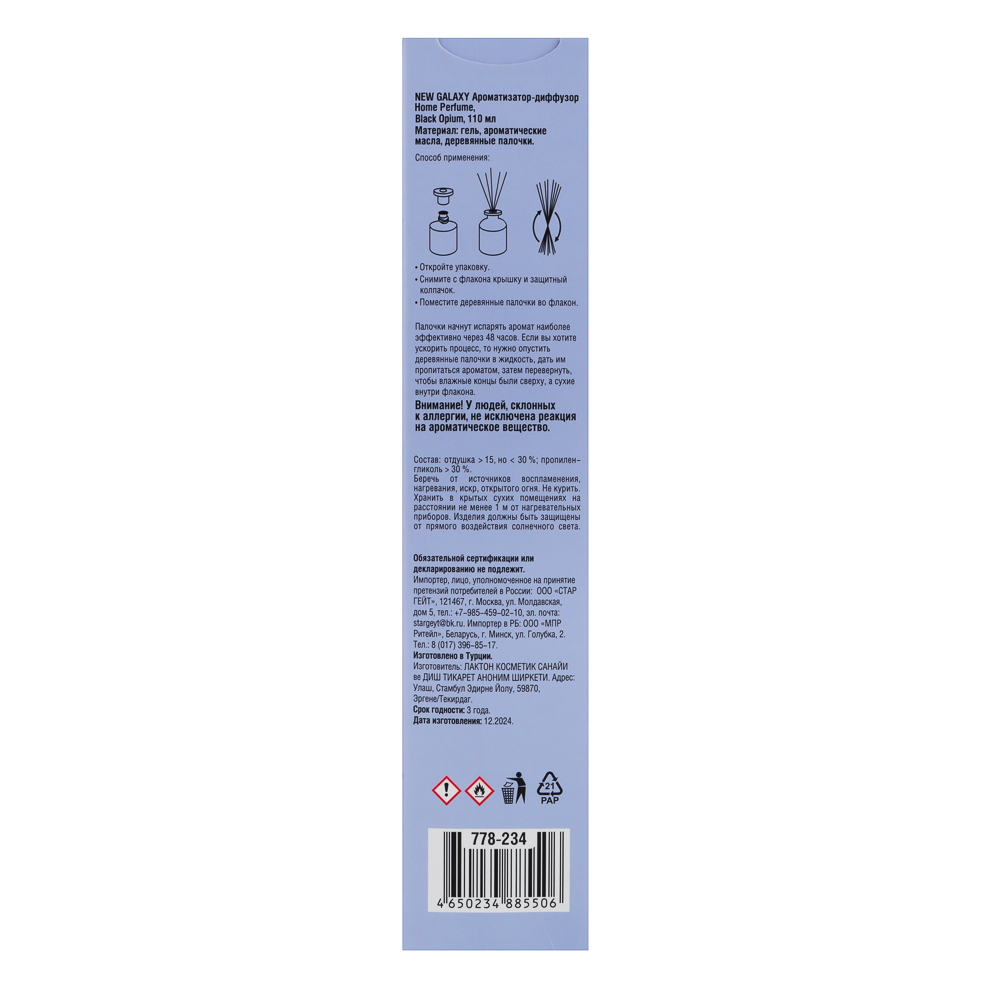 Ароматизатор диффузор NEW GALAXY «Home Perfume» с ароматом «Black Opium», 110 мл подходит для использования в жилых помещениях, офисах и санузлах. Богатая ароматическая композиция с нотами кофе, розового перца и душистых цветков апельсина и жасмина дарит ощущение бодрости и прилив сил, а также создаст особую атмосферу в вашем доме. Эффективно маскирует неприятные запахи. Прозрачный флакон с черными палочками имеет лаконичный дизайн и впишется в любой интерьер. Деревянные палочки эффективно распределяют аромат по всей площади.