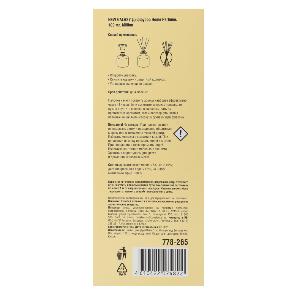 Аромадиффузор Home Perfume от NEW GALAXY с ароматом по мотивам парфюма Million — роскошный аксессуар, который подарит вашему дому атмосферу изысканности и благородства. Благодаря уникальной композиции, включающей высококачественные эфирные масла (свыше 30%), воду (более 15%) и ароматическое масло (более 5%), диффузор создает стойкий и утонченный аромат, напоминающий знаменитые ноты парфюма Million. Объем флакона 100 мл обеспечивает продолжительное и равномерное насыщение пространства благородным шлейфом без необходимости использования электричества или открытого пламени. Элегантный дизайн и компактные размеры делают его идеальным украшением для спальни, гостиной, ванной комнаты или офиса. Погрузитесь в мир роскоши и уюта с этим аромадиффузором, который подчеркнет ваш изысканный вкус и создаст неповторимую атмосферу в любом помещении.