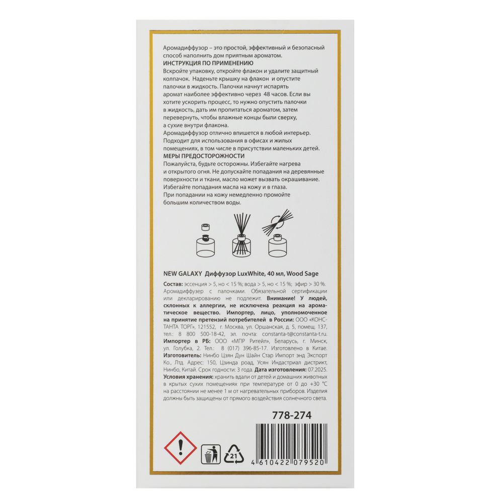 Диффузор с палочками NEW GALAXY «LuxWhite», 40 мл, с ароматом Wood sage – это простой и эффективный способ наполнить дом приятным ароматом для создания уютной и расслабляющей атмосферы. Аромат создан специально для тех, кто стремится к гармонии и внутреннему спокойствию. Пробуждающая свежесть горного шалфея и теплые древесные ноты создают сбалансированный и ненавязчивый букет. Утонченный стеклянный флакон белого цвета имеет минималистичный дизайн и будет актуально смотреться в любом интерьерном стиле: сканди, эко-лофт, современная классика. Тростниковые палочки равномерно распространяют аромат, заполняя пространство легким фоновым шлейфом. Хороший вариант для подарка.