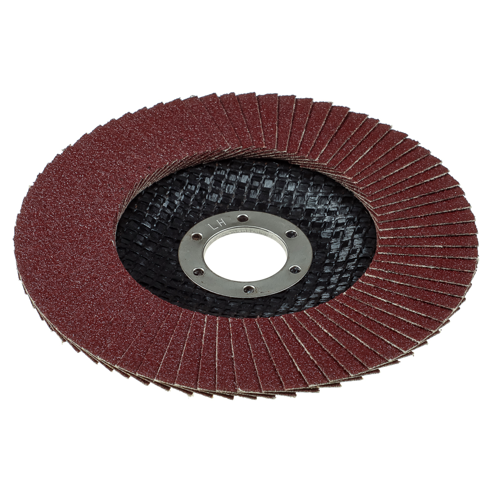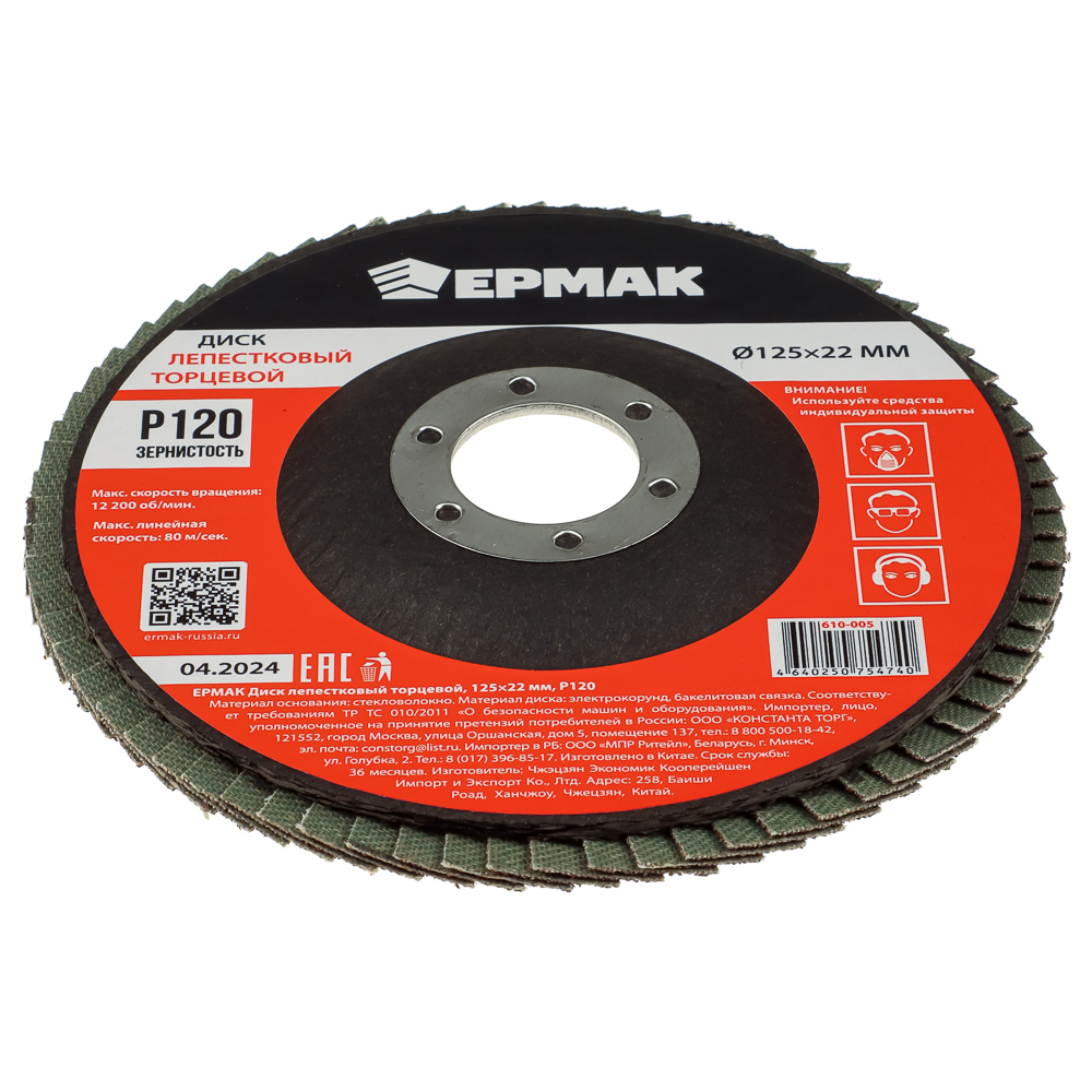 Лепестковый торцевой диск ЕРМАК 125x22 мм со степенью зернистости p120 предназначен для использования совместно с угловой шлифовальной машиной с максимальным числом оборотов 12200 об/мин. Максимальная линейная скорость – 80 м/сек. Эффективен для грубой шлифовки плоских, а также вогнутых поверхностей из металлов и сплавов, а также древесины и полимеров. Материал основания – стекловолокно. Материал диска – электрокорунд и бакелитовая связка. Диск прочный, долговечный, износостойкий, имеет длительный ресурс службы.