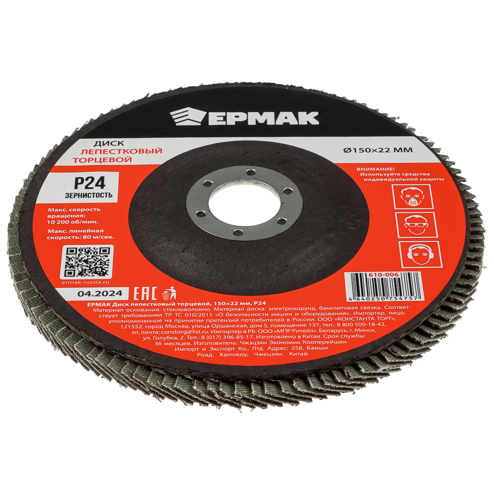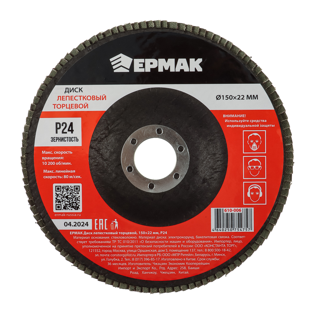 Лепестковый торцевой диск ЕРМАК 150x22 мм с зернистостью р24 используется для грубой шлифовки поверхностей, снятия старых лакокрасочных покрытий, устранения неровностей и зачистки сварных швов. Максимальная скорость вращения – 10200 об/мин. Максимальная линейная скорость – 80 м/сек. Основание из стекловолокна делает диск прочным, устойчивым к поломкам и деформации. Материал диска электрокорунд на бакелитовой связке устойчив к износу, поэтому диск долго будет сохранять абразивные свойства. Используется совместно с УШМ.