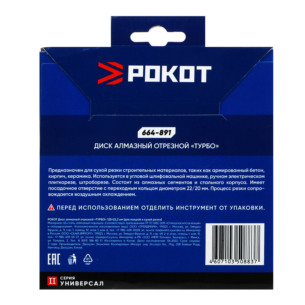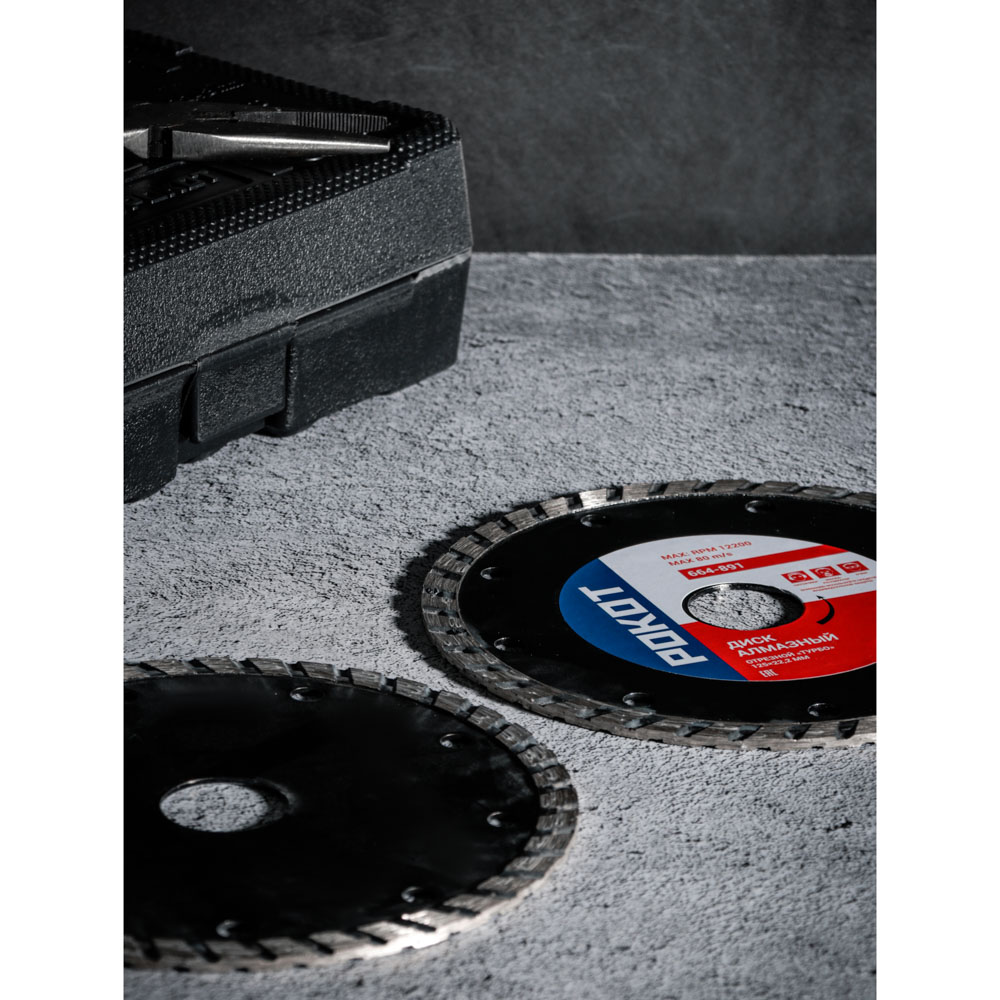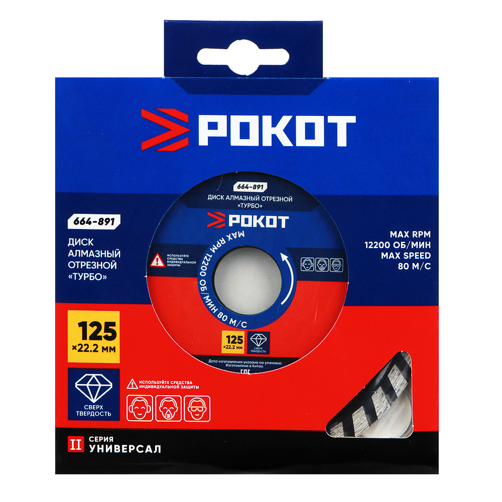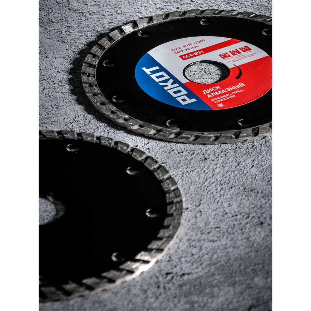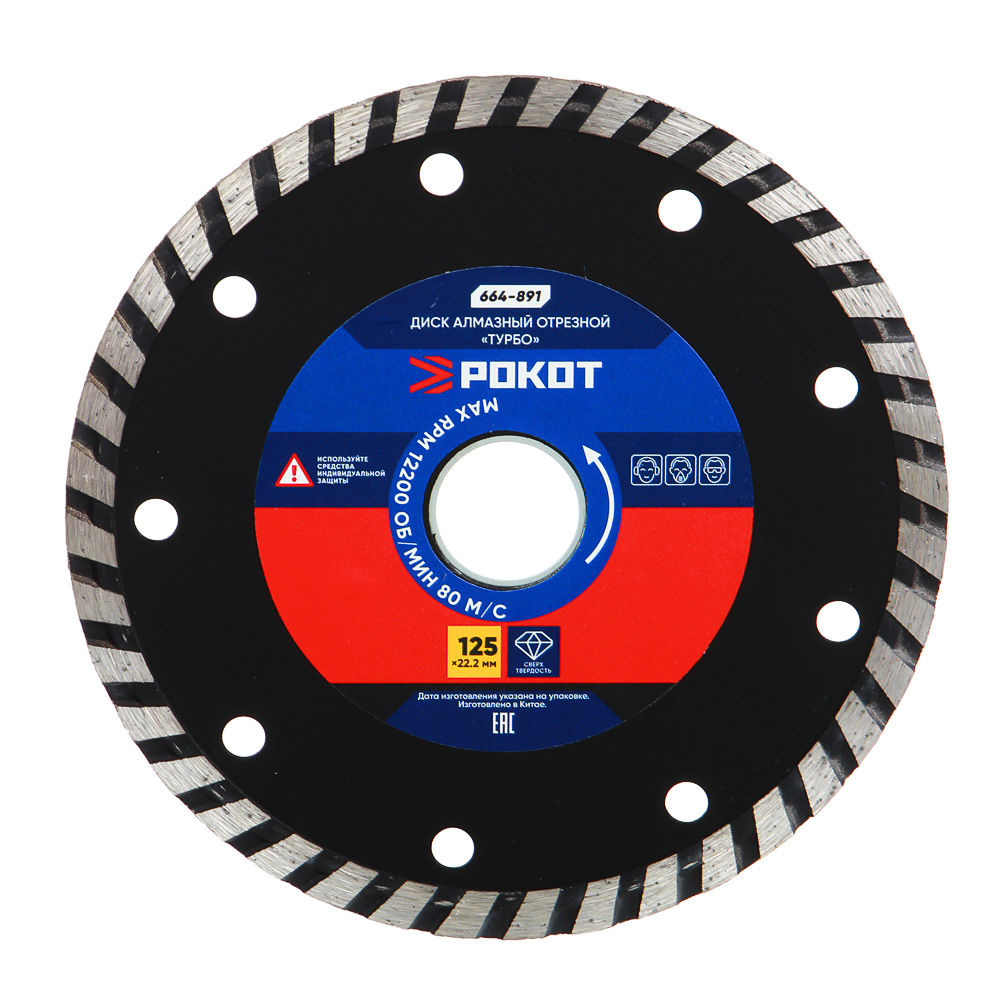 Алмазный отрезной диск РОКОТ «ТУРБО» 125х22,2 мм предназначен для сухой резки бетона, кирпича и керамики. Используется в УШМ, ручном электрическом плиткорезе и штроборезе. Сегменты из алмазного порошка обладают максимальной твердостью, а корпус из 65 стали устойчив к механическому воздействию, не деформируется, прочный и износостойкий. Диск обеспечивает качественный и эффективный рез, подходит для многократного использования. Для работы необходимы средства индивидуальной защиты: наушники, маска-респиратор, очки.