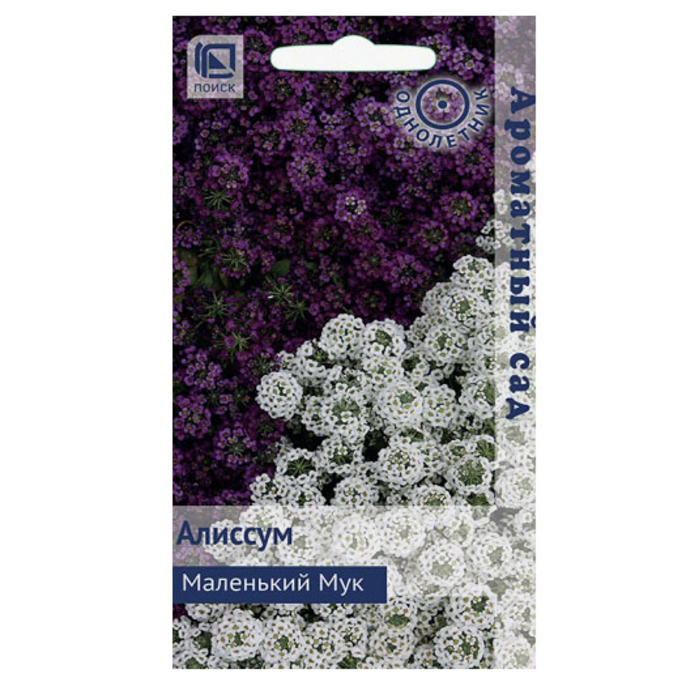 Семена алиссума сорта «Маленький Мук» предназначены для выращивания однолетнего растения с контрастной смесью цветов и медовым ароматом. Растение невысокое, высотой до 15 см, образует плотный, стелющийся бело-фиолетовый ковёр. Листья узкие, ланцетные. Цветёт с июня до осени; для непрерывного цветения периодически удаляют увядшие цветы и плоды. Используется для обрамления клумб, балконных ящиков, на каменистых горках, рокариях, для посадки между плитками дорожек. Растение холодостойкое, предпочитает хорошо дренированные, лёгкие почвы и солнечное место. Размножают посевом семян в грунт в начале мая или под зиму. Глубина заделки — 0,3–0,5 см. Всходы появляются при температуре почвы +18°C через 8–14 дней. Сеянцы прореживают, оставляя расстояние между растениями 8–10 см. Вес семян в упаковке — 0,3 г (±9%).